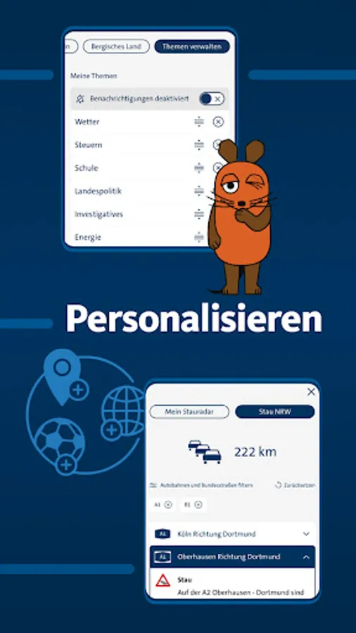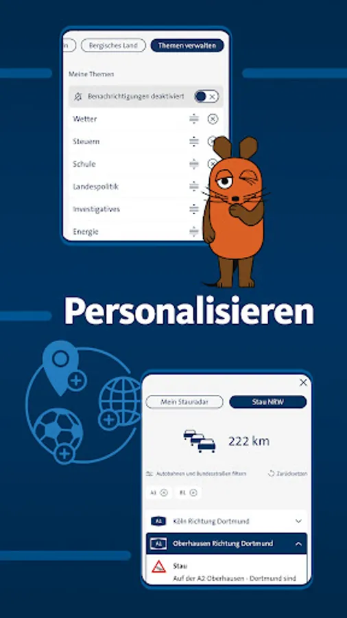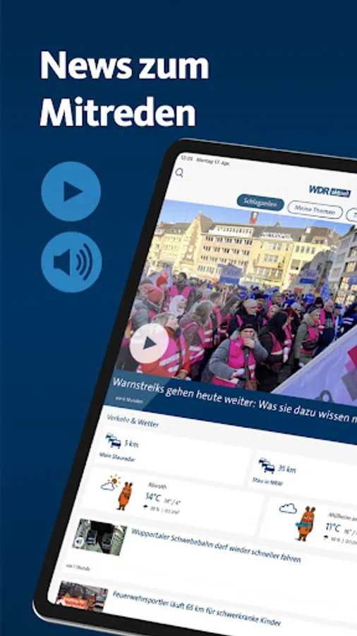 The new WDR aktuell app presents the most important news from North Rhine-Westphalia, Germany and the world, including sports news - compactly and clearly in text, audio and video. In addition, you can quickly and easily compile your personal news feed and receive current weather and traffic information, which you can also adapt to your needs.