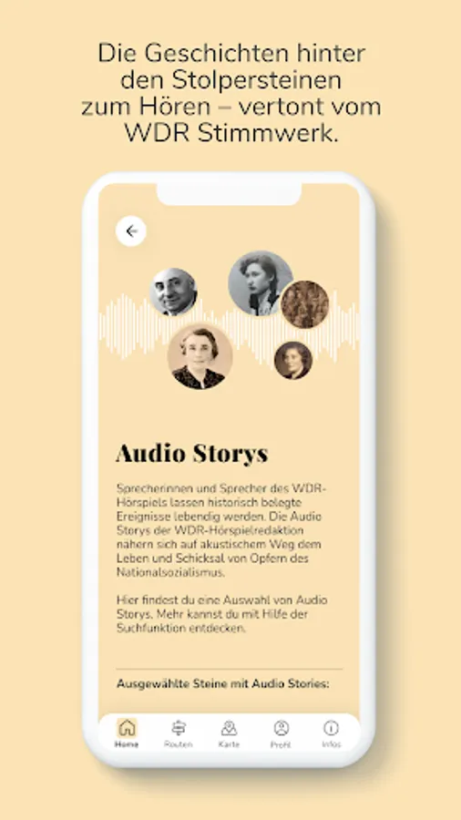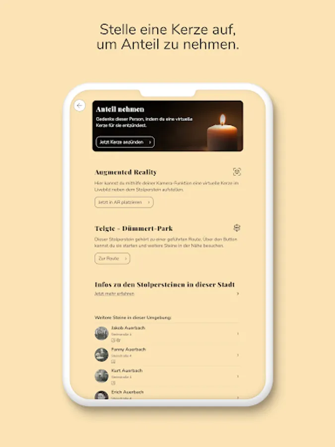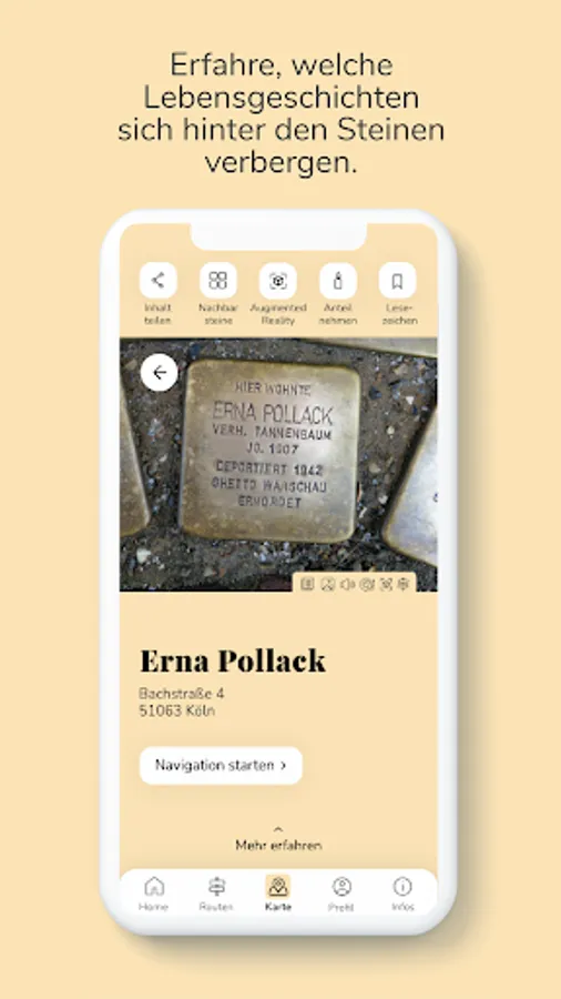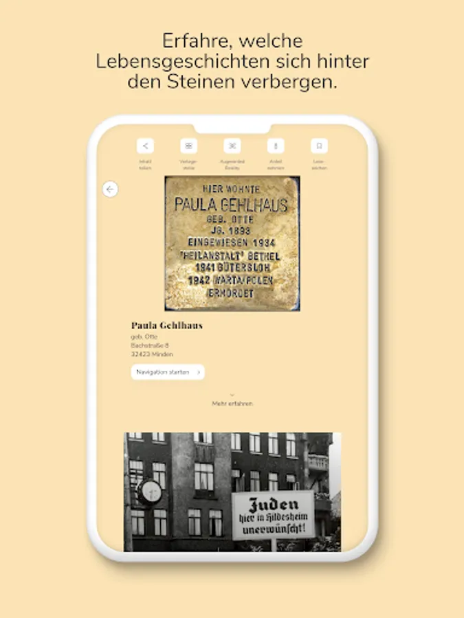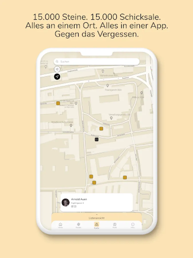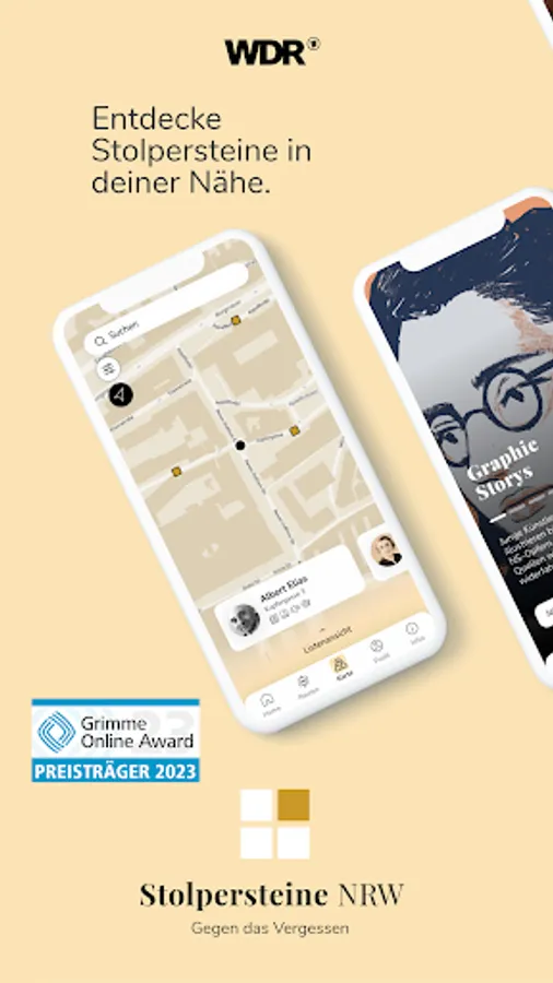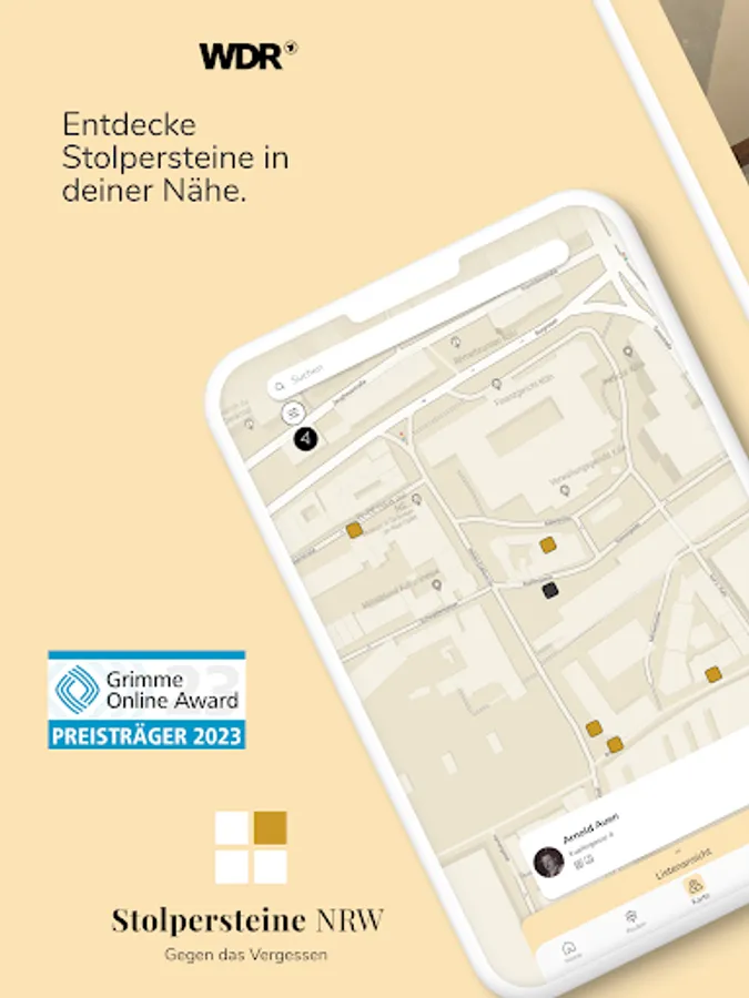 Stumbling blocks commemorate the victims of National Socialism. With texts, photos, audio, graphic stories and augmented reality elements, the app provides interactive information about people who lived on your street or in your city during the Nazi era: NRW stumbling blocks bring history to life.