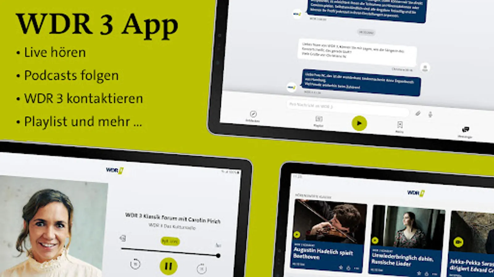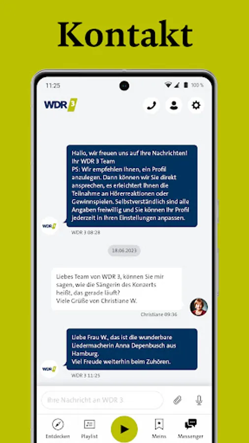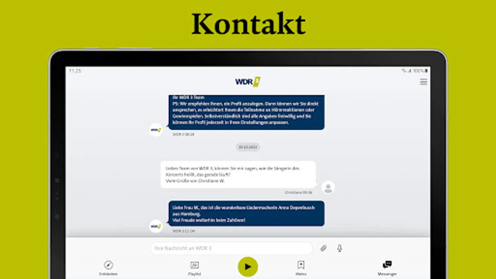 If you would like to send us suggestions, praise or criticism, we look forward to receiving your feedback at wdr3app@wdr.de or via the app's messenger function.