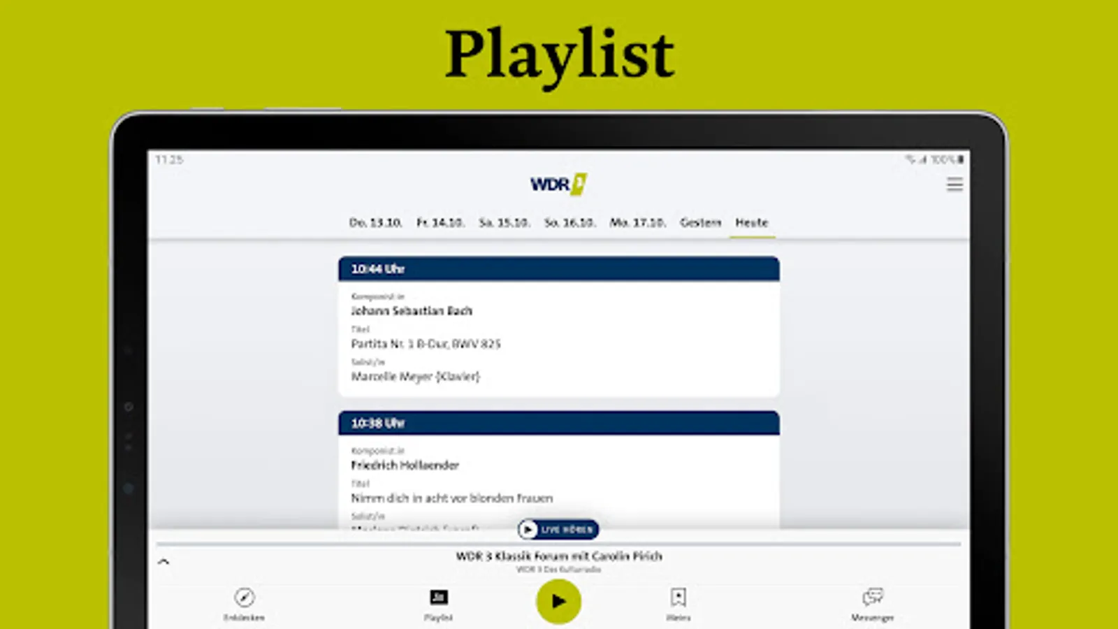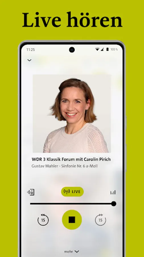 You can listen to the current WDR 3 program live in the player or jump back up to half an hour if you want to hear a song from the beginning, the news or a contribution again. The player also tells you which title is currently playing and who is moderating it.