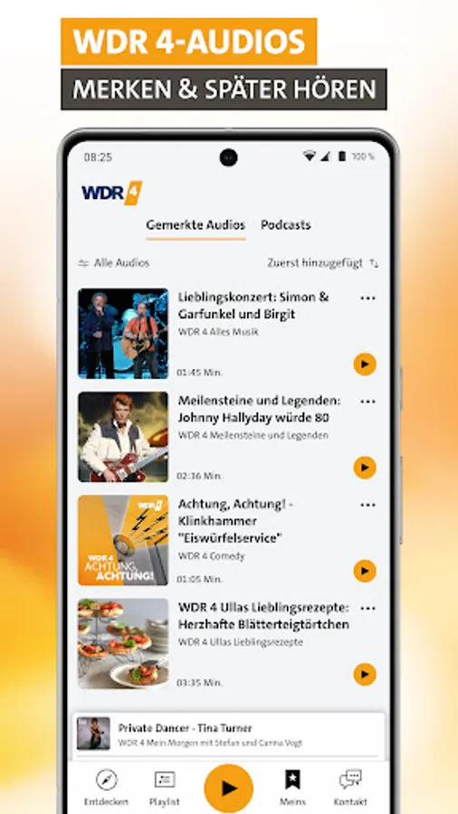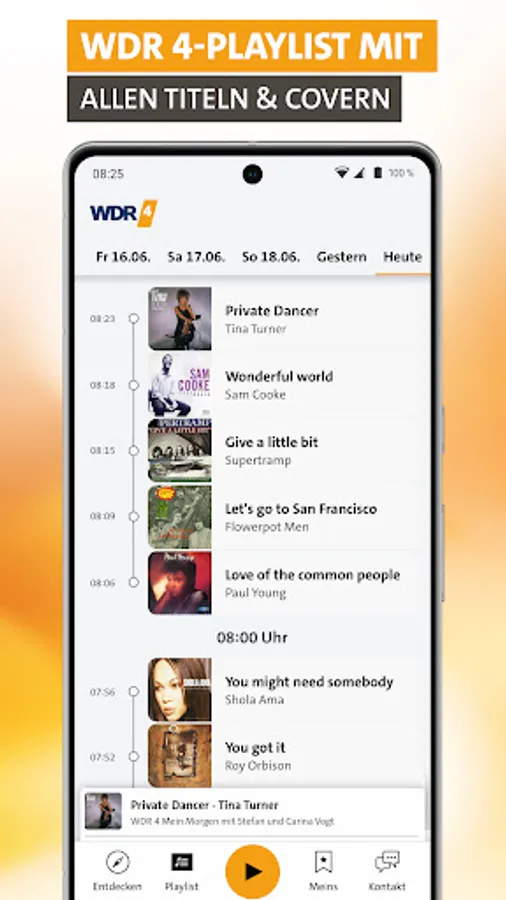 You can listen to the current WDR 4 program live in the player or jump back up to 25 minutes if you want to hear a song from the beginning, the news or a contribution again. The player also tells you which title is currently playing and who is moderating it.