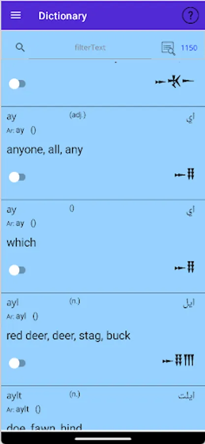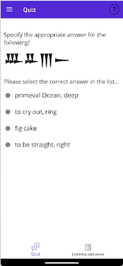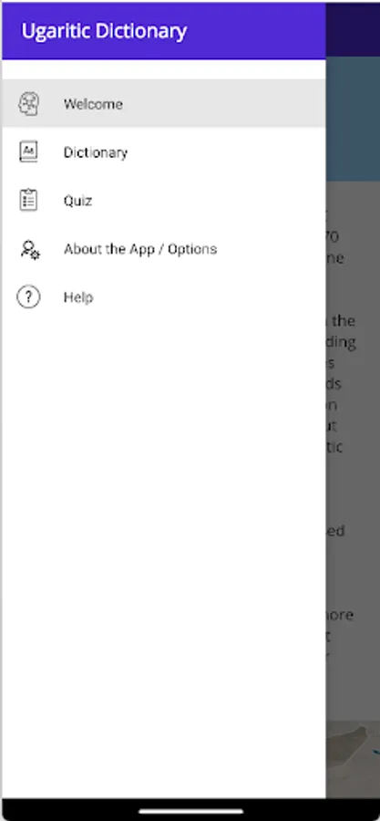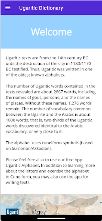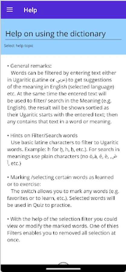 The Dictionary provides about 1150 words (Ugaritic, English, German, Arabic as well as the pronounciation in Latin and Arabic). A quiz for any number of desired Words (by selection) could be trained. The outcome is stored only on the device and could be reset any time.