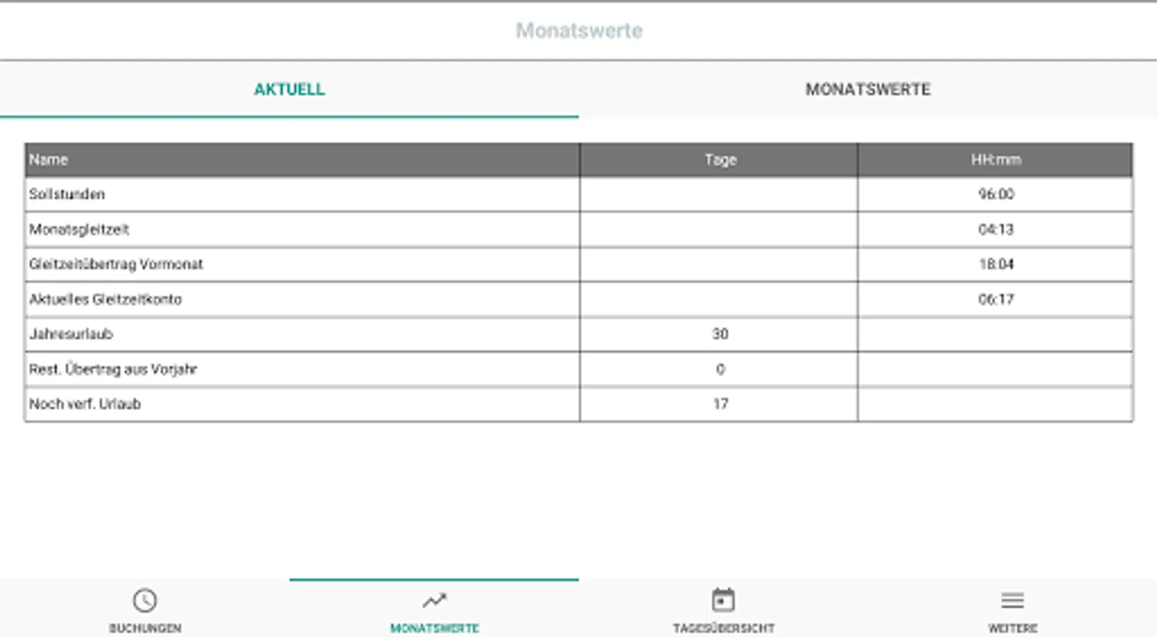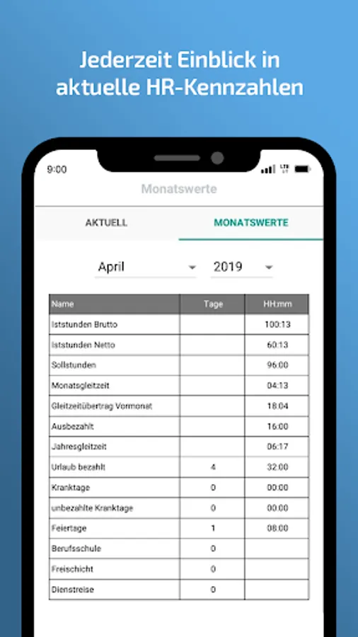 • Display of monthly values, daily values, time balances, remaining vacation, etc.