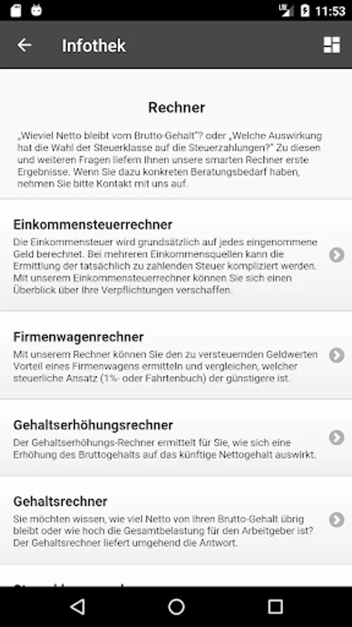 Also on selected tax issues, the app keeps ready information: What is important in running a logbook? What are the possibilities of tax-privileged content employee benefits are there? For these and other topics, the app provides you with the answers.