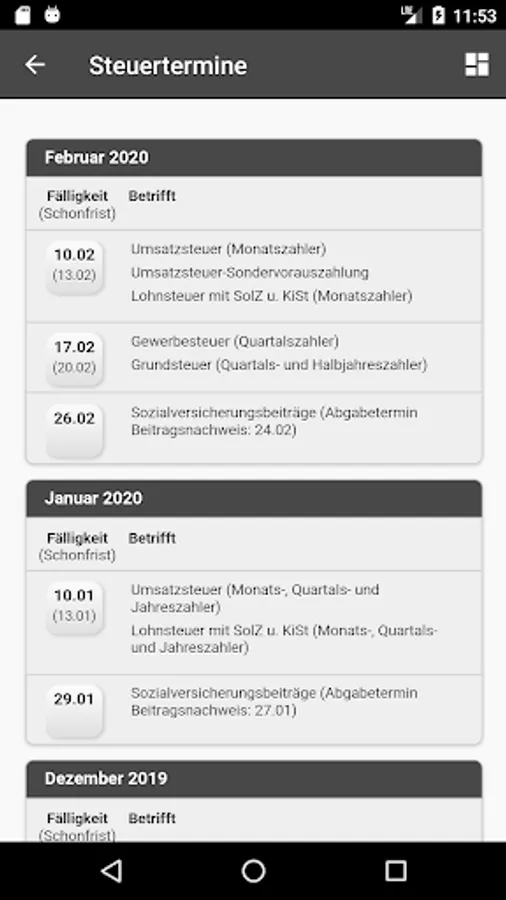 You want to know, when that tax payment dates? Whether, for example, Income tax or sales tax deduction, income tax or business tax - in the app you can find the corresponding dates.
