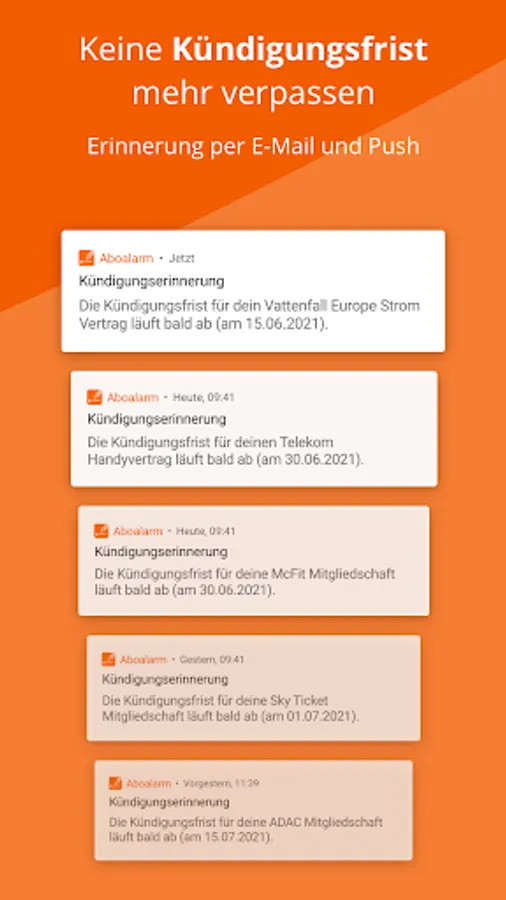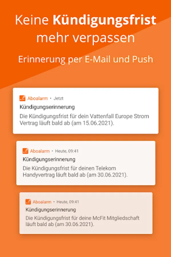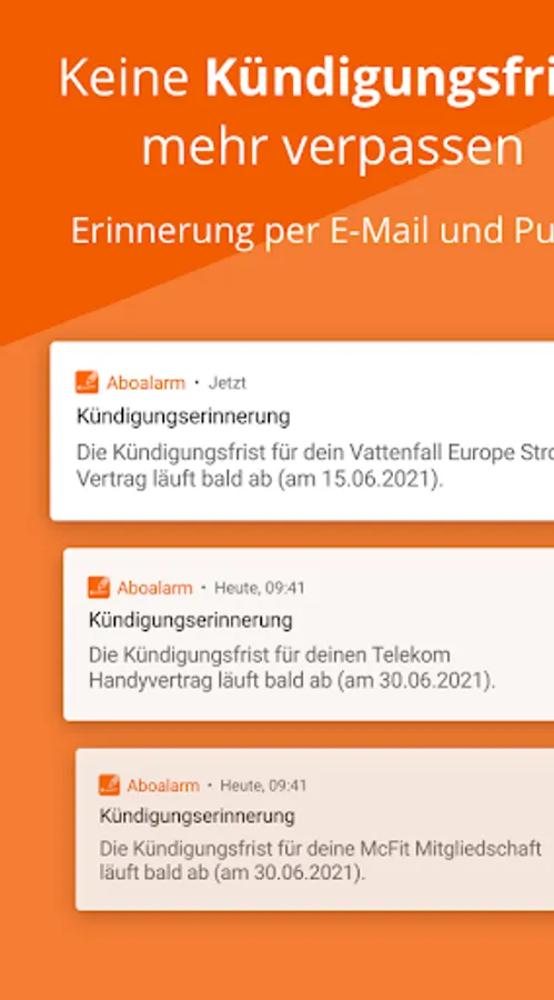 At aboalarm you will find everything you need to easily terminate and revoke your contracts. Let the aboalarm app remind you of notice periods and deal with cancellations conveniently and securely in just 2 minutes.