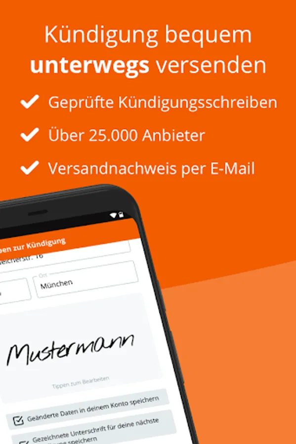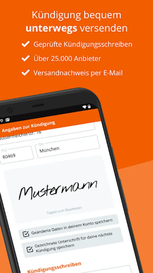 Simply select your contractual partner from over 25,000 providers, send the legally verified letter of termination directly via the app and then receive proof of the successful sending of your termination by email. For the majority of all 25,000 providers, the aboalarm cancellation guarantee * also applies to successful shipping without any follow-up costs.