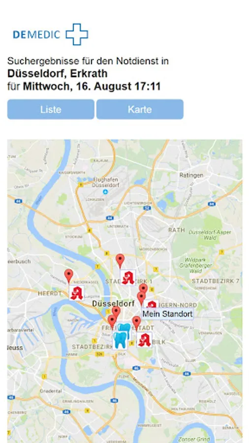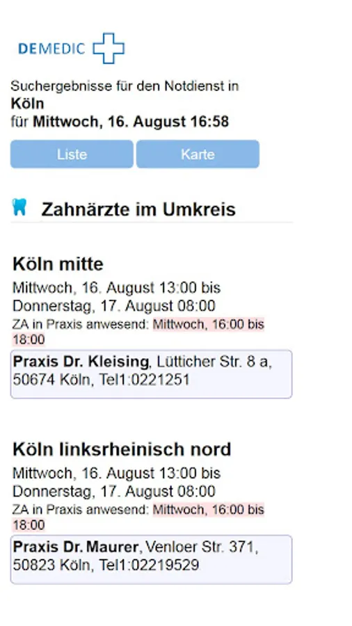 DEMedic is an app for patients who, among other functions, also informs about the current dental emergency service as well as the pharmacy emergency service (currently only North Rhine-Westphalia). Patients receive real-time information about the respective emergency service as a list or in a map view with just one click.