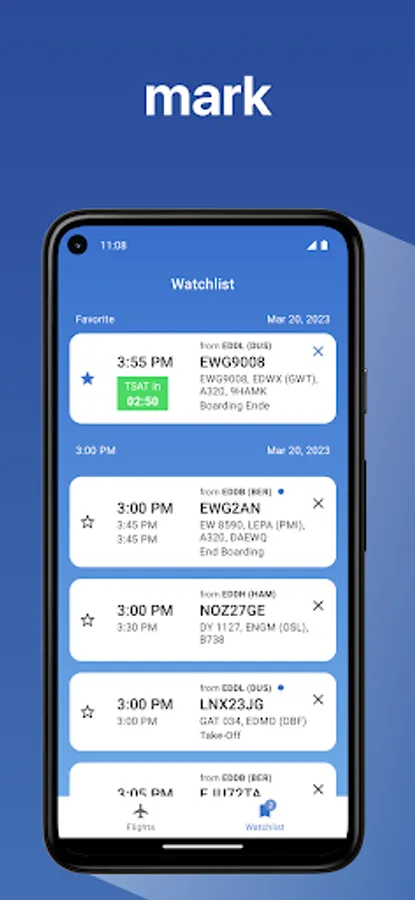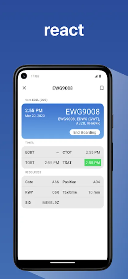 You will find all planned departures for the next 36 hours in a searchable and filterable list. Mark any number of flights and receive the latest CDM milestones, de-icing information and other interesting data on the observed flight. Visual highlights and push notifications provide immediate updates on changes in the process sequence.