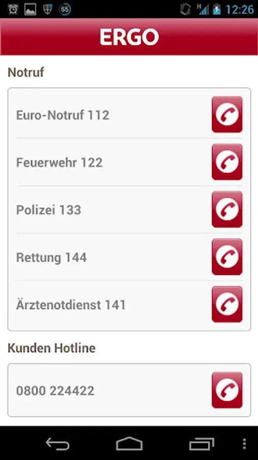 The emergency call button will accompany you on the top right. With just one click you have euro-emergency, fire, police, rescue and medical emergency at hand and start the rescue chain even faster. You can also find the 24-hour emergency hotline for our customers and Assistance ERGO customer hotline, if you simply want to ask something.