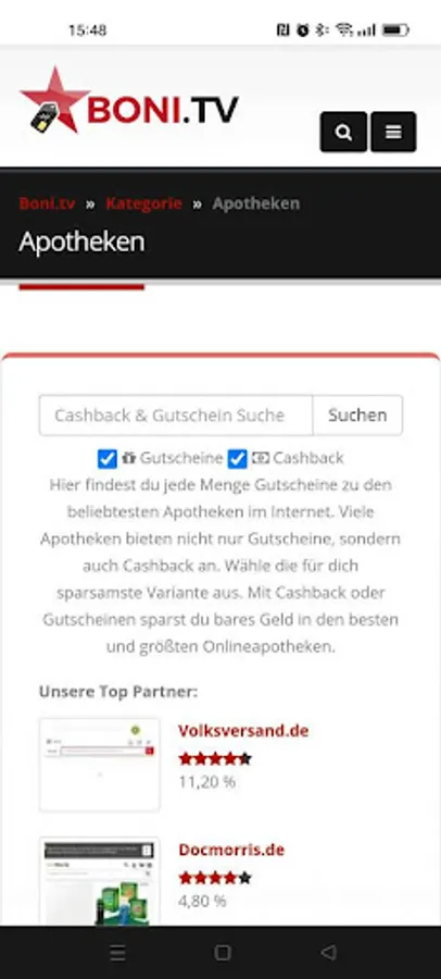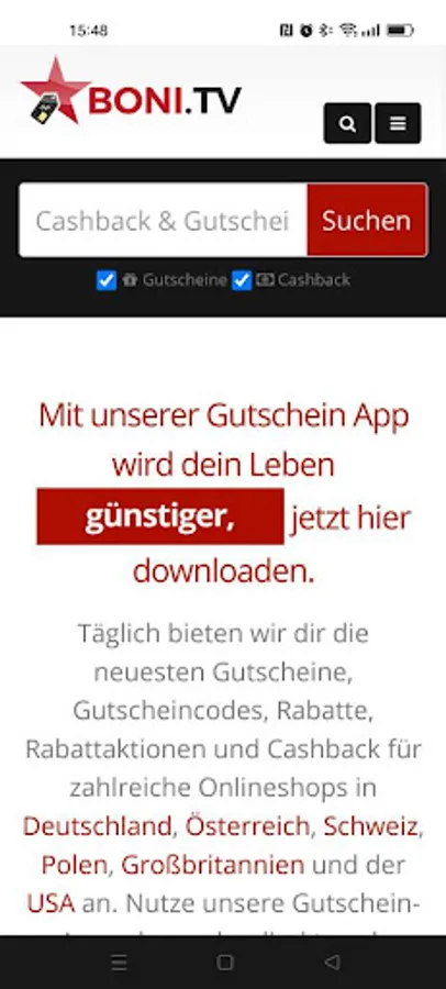 We offer cashback and vouchers for shops from Germany, Austria, Switzerland, Poland and Great Britain (USA follows). Depending on which country you are from, you only see corresponding shops.