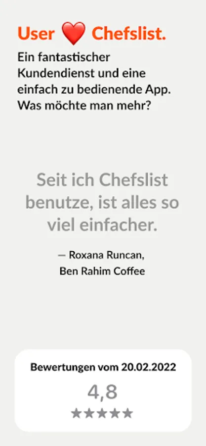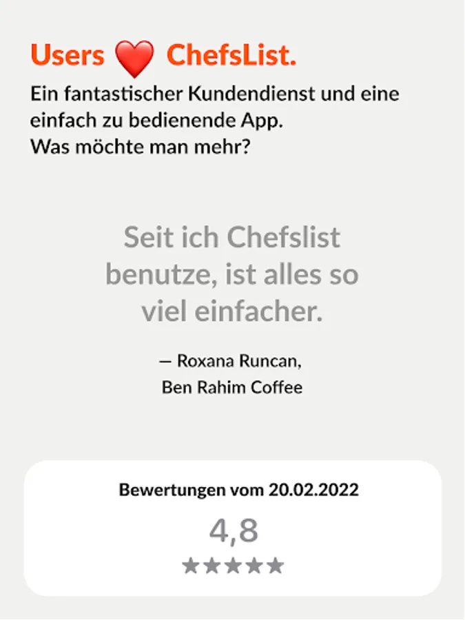 Do you have anymore questions? Then you are welcome to contact us at +49 69 850 90 393 or support@chefslist.de.