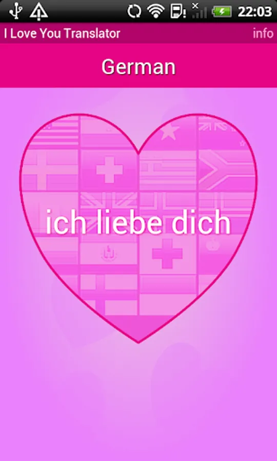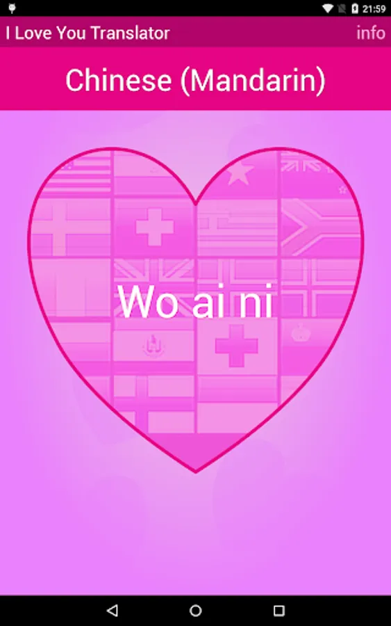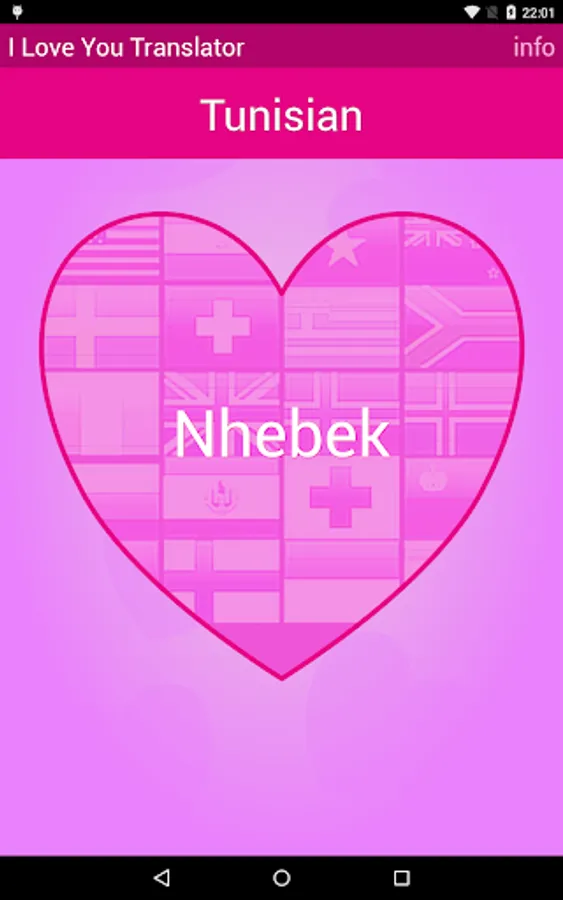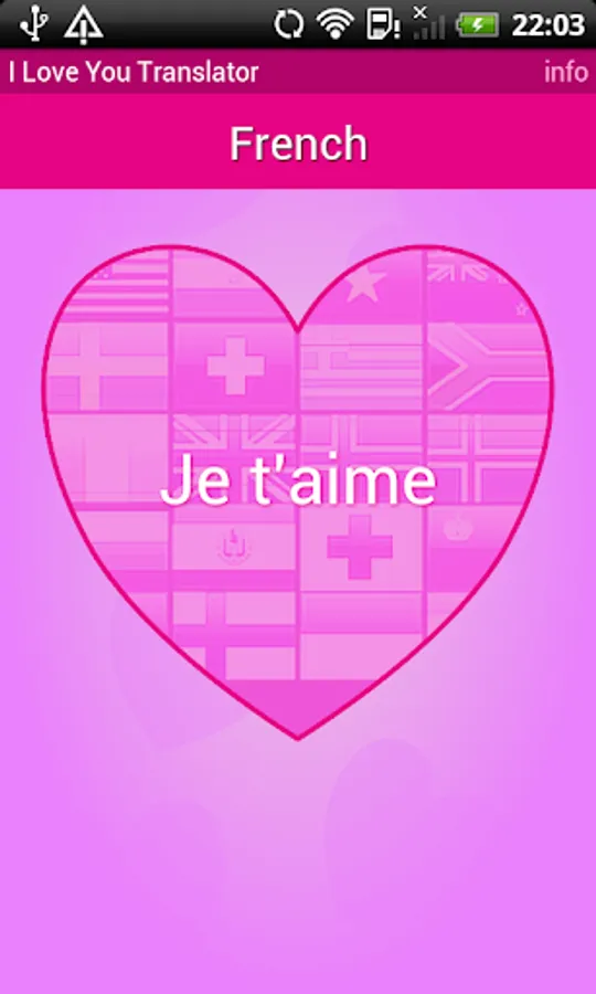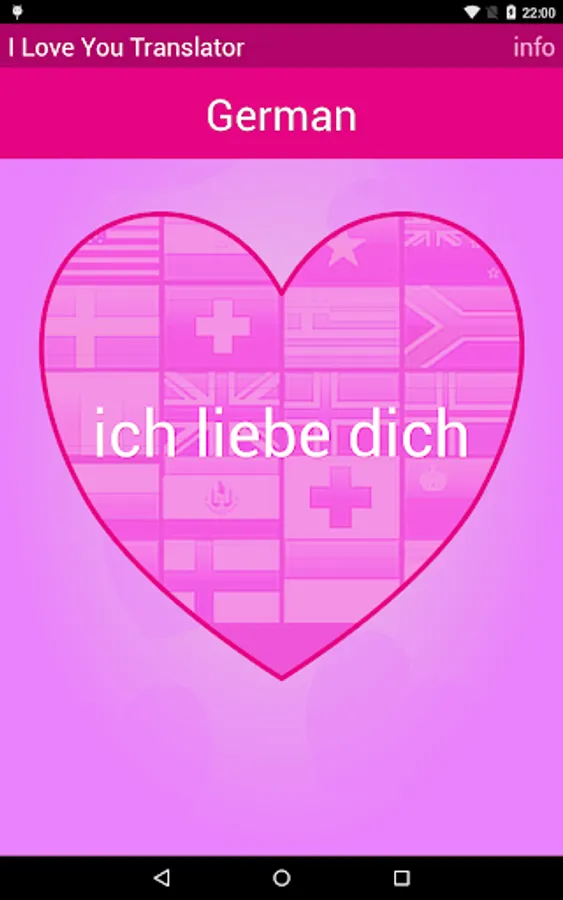 In total "I love you“ was translated into round about 80 world languages. Search specifically for a translation or inspire anew every day. Click long the current language on mainscreen for a random selection. Use the volume buttons (up and down) to quickly move to the next language of love.