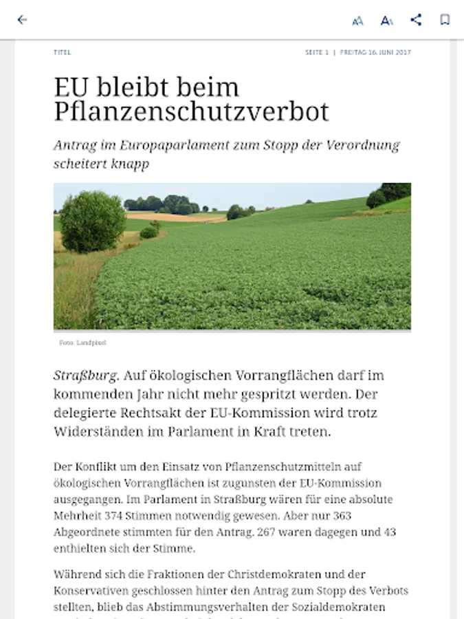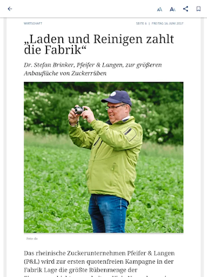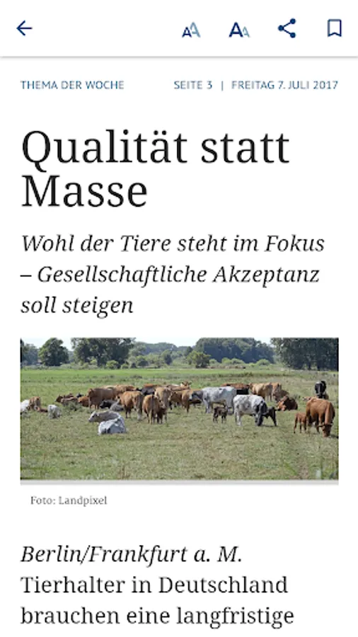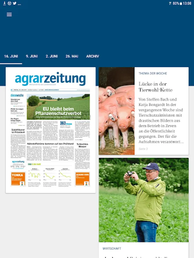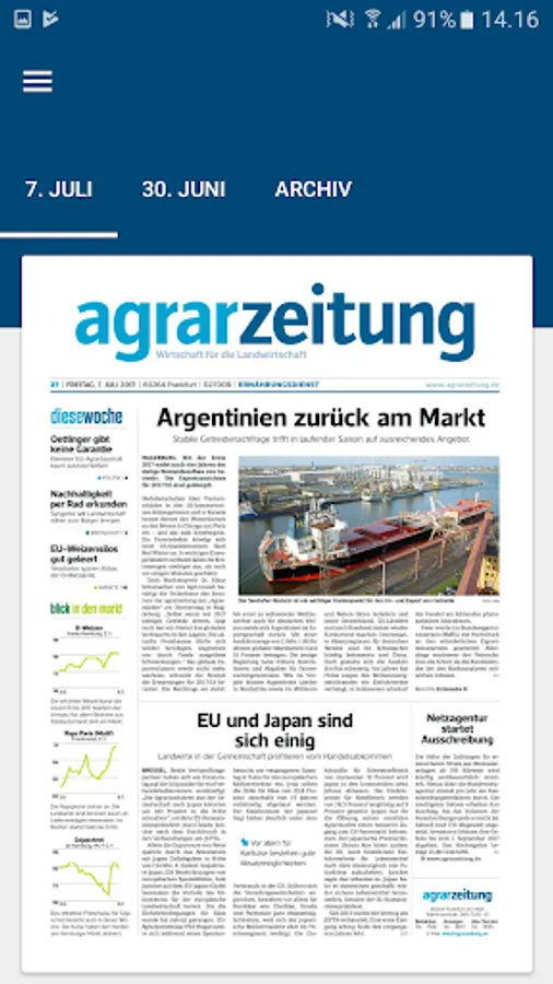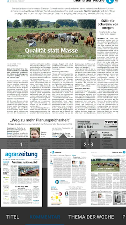 It is easy and convenient to read in the original view, the leaves 'agrarzeitung' BROWSE via finger swipe and zoom by finger pull. A search function allows you to search for keywords across the entire issue and the App archive. Every single item can be tapped and will appear in a scalable, clearly structured reading mode in portrait and landscape mode. Also image galleries can be viewed.