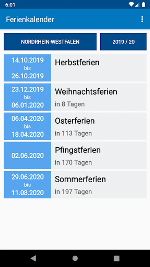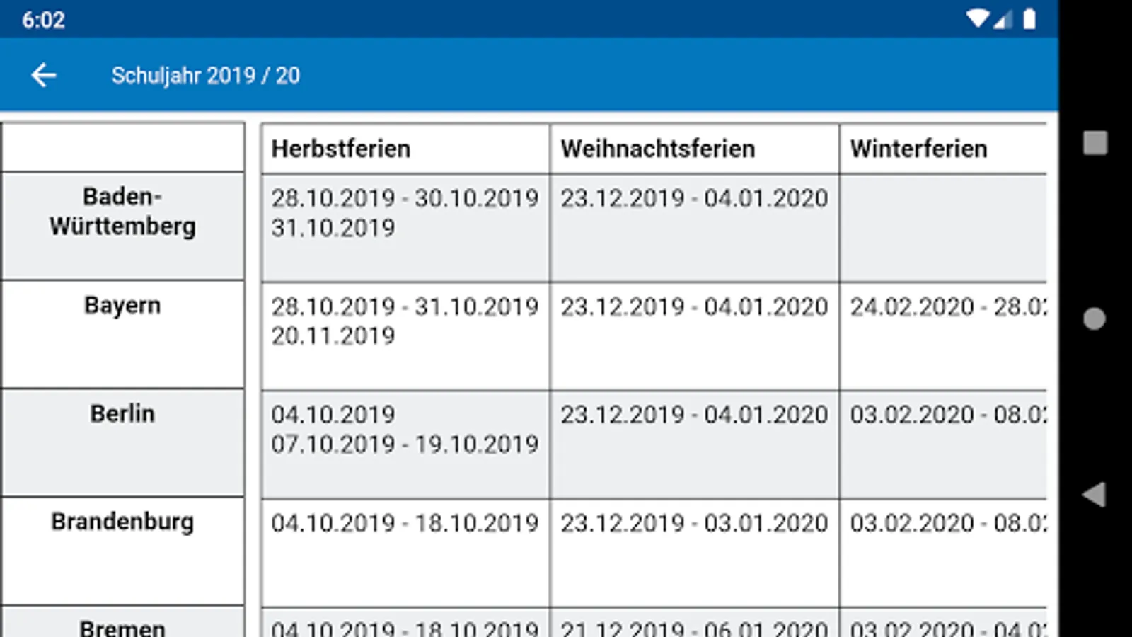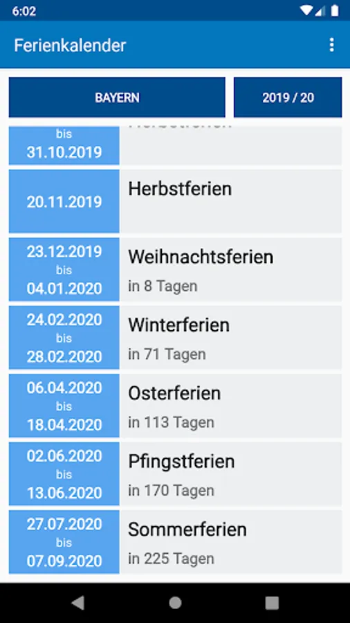 The vacation dates for the school years 2019/20, 2020/21, 2021/22 and 2022/23 are currently entered for all 16 federal states.