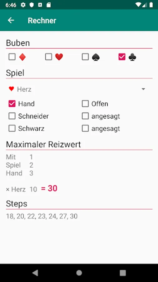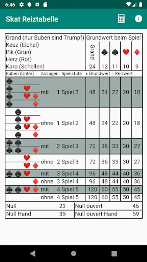 This app will provide you with a Skat Stimulation Table, which shows you the maximum stimulus value for each game depending on your Jack combination.