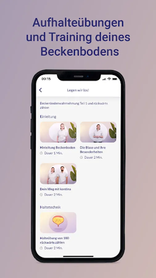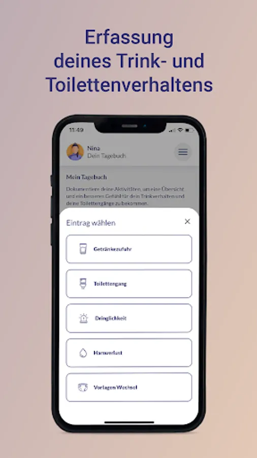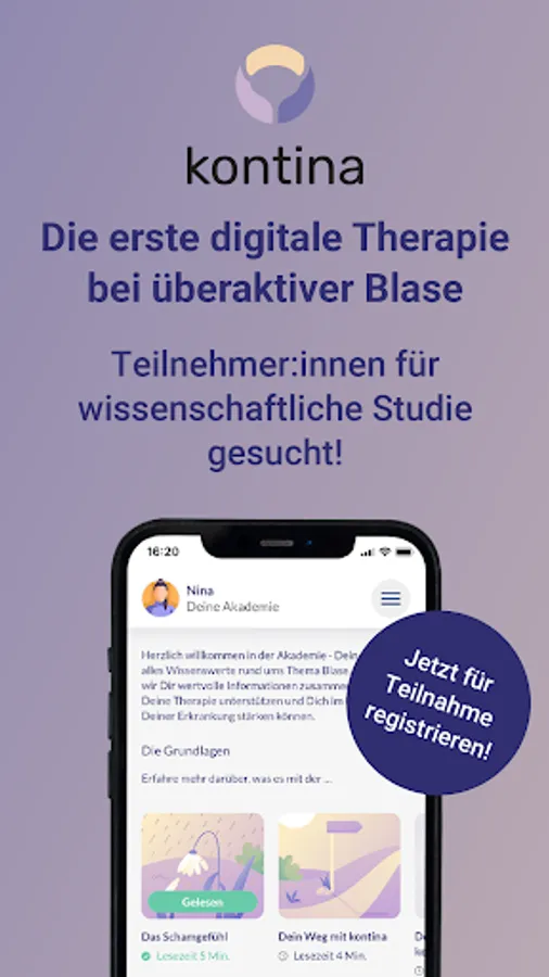 kontina is a newly developed medical device for the treatment of symptoms associated with an overactive bladder (OAB). The app supports you in reducing your symptoms yourself and regaining your quality of life. The program is currently being scientifically evaluated for its effectiveness. If you yourself suffer from the consequences of an overactive bladder with or without urinary incontinence (unwanted loss of urine) and are looking for a therapy program with a holistic approach, you can register for the study. You can find more information about kontina, the study and whether kontina is suitable for you at https://kontina.com. The application offers acute help with an urge wave and provides long-term support for a positive change in health-related behavior. Participation in the study is free of charge. After a successful application to take part in the study, you will be assigned to either the intervention or the control group. If you are in the intervention group, you will receive an activation code and can use the app to its full extent immediately. Participants in the control group receive access to the app after a waiting period of only 12 weeks.