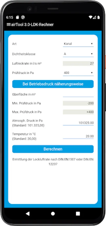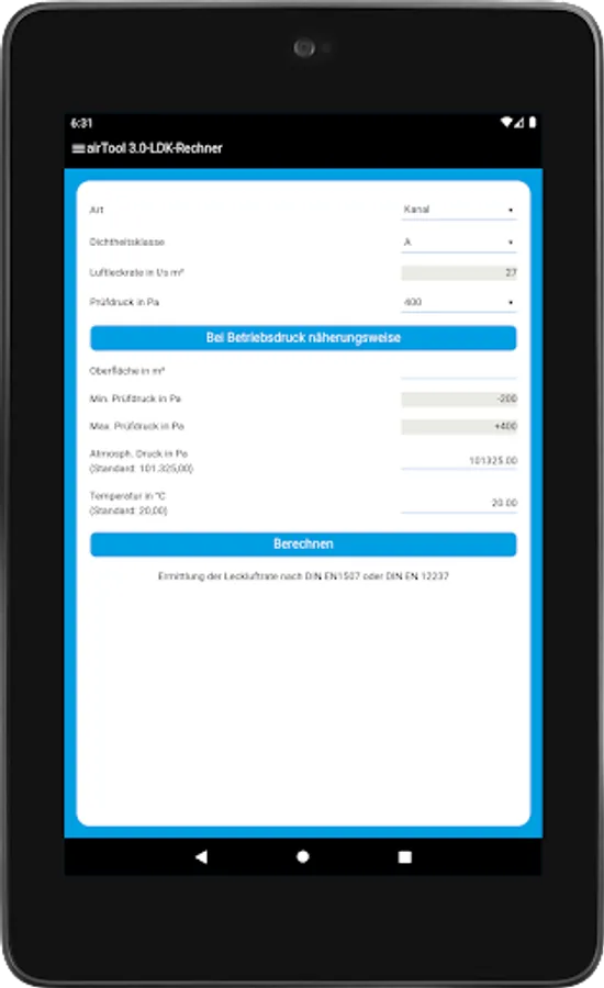 Easy-to-use calculation tool to determine the air leakage rate of a duct or pipe system. The surface of the duct can be entered or taken from the duct/pipe calculator. If the test pressure is then entered, the air leakage rate is calculated according to the selected airtightness class. An approximate extrapolation of the leakage air flow is possible. It is possible to define your own airtightness class.