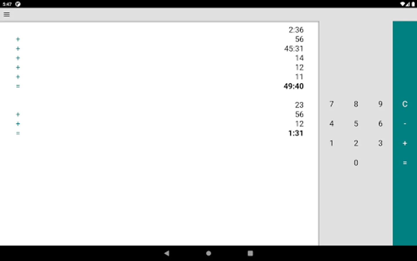 A simple calculator app that adds times given in hours and minutes. It helps with the recording of machine running times, with the addition of flight times in your pilots' flight log, or your driving times as a truck driver.