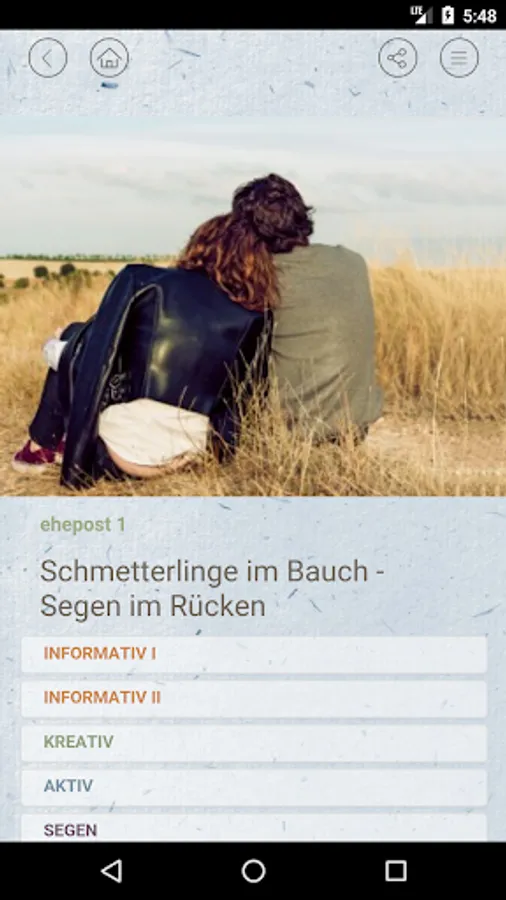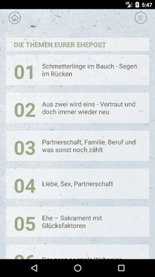 The app for all who are fresh or have been married for some time. Receive the marriage mail for one year. Once a month there are informative texts, creative ideas, active elements and a blessing for you. Free.