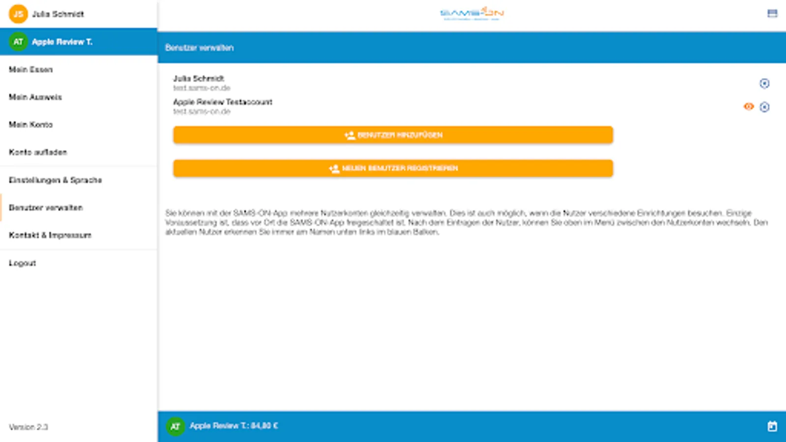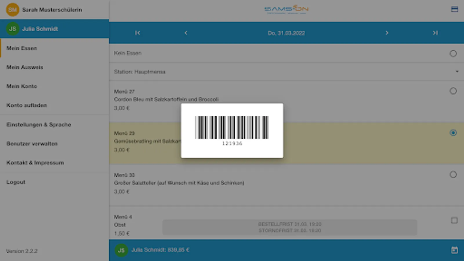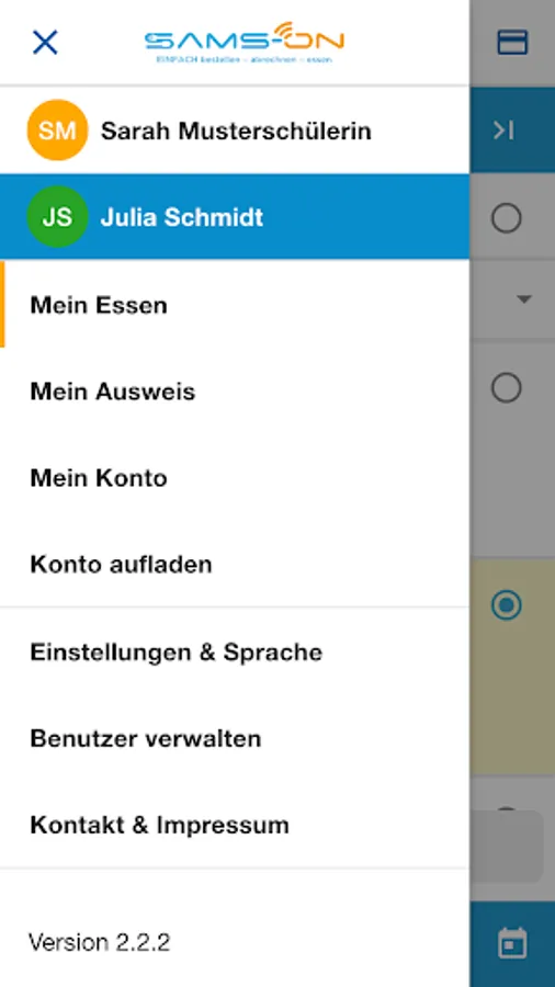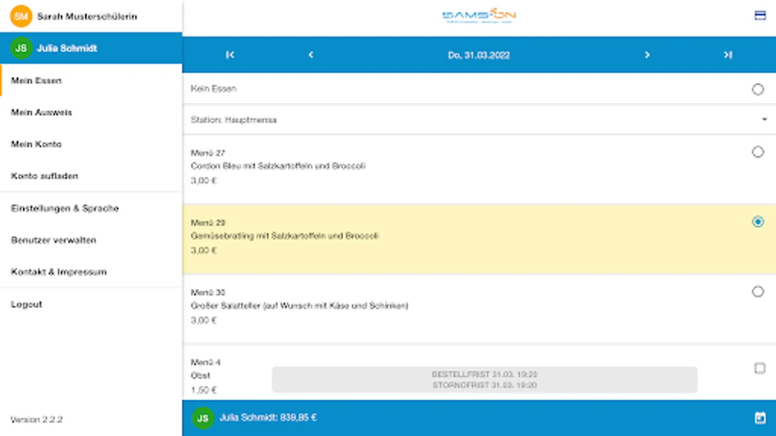 Is "SAMS-ON" used for user administration in your on-site canteen or canteen? Then you can now conveniently access your user account via the app: view the plan, order food, access your account, manage your ID card: all of these functions are now also available to you on your smartphone and tablet.