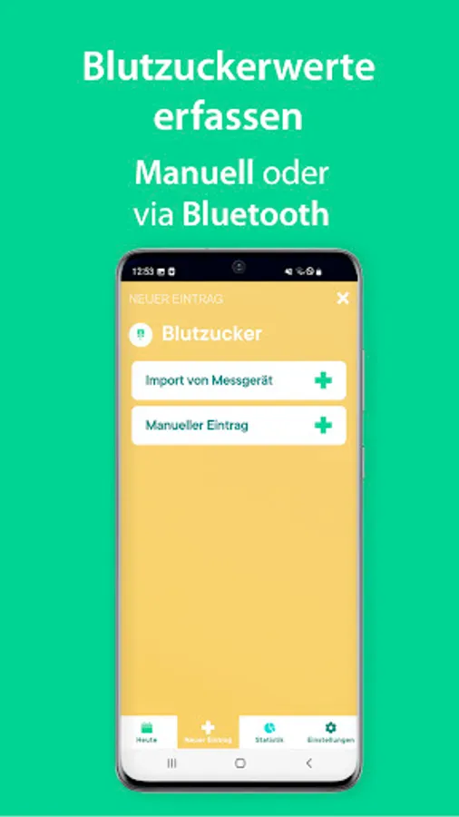 • Blood sugar values – the blood sugar values can either be imported from the GlucoCheck GOLD blood sugar measuring system via Bluetooth or entered manually into the app.
