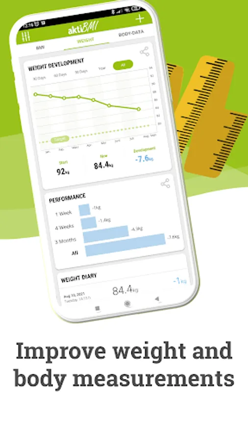 The APP provides you with a detailed body weight diary including graphical statistics on your body weight improvements. When updating your body weight, the App will track and comment on your achievements and continuously encourage you to improve. With the included BMI calculator you can easily calculate your BMI (Body Mass Index) and find out from graphical interpretations whether you are overweight, underweight or have normal weight.