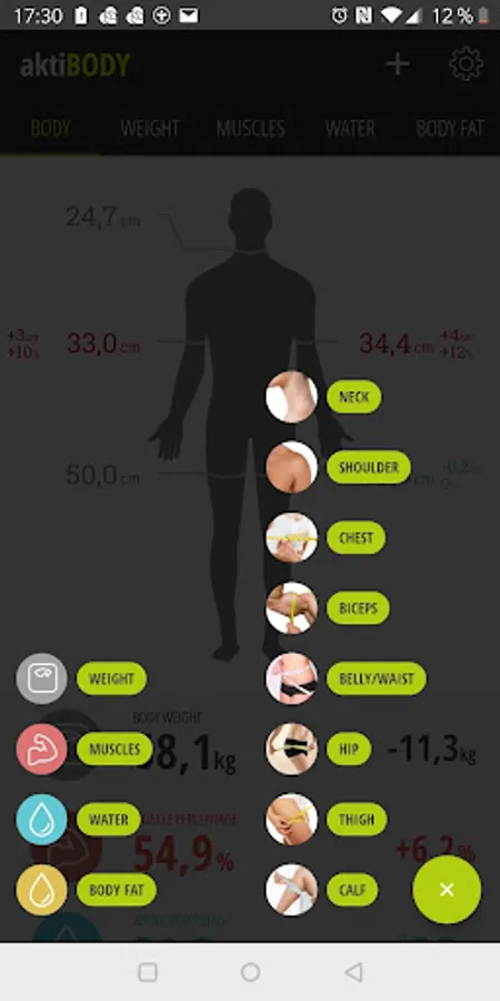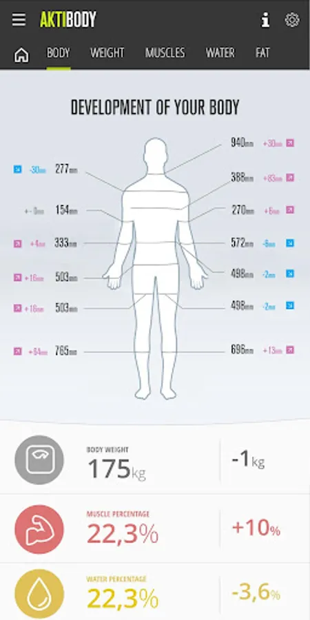 with aktiBody you can not only measure your body weight, but you can also keep an eye on your body fat percentage and water weight. Furthermore, you can determine and enter your body measurements (waist circumference, chest circumference, thigh circumference, etc. using a measuring tape and evaluate them.