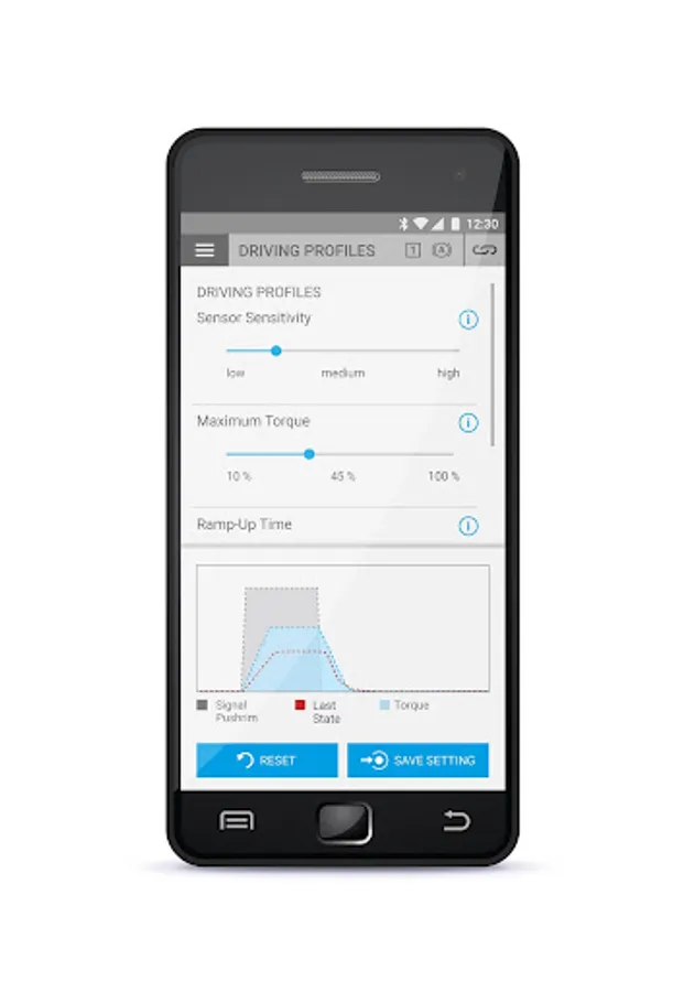 In the protected professional section you can individually adapt the driving behaviour of the e-motion. The following parameters can be adjusted: Maximum speed, maximum torque, sensitivity of the sensors as well as the ramp-up and follow-up time.