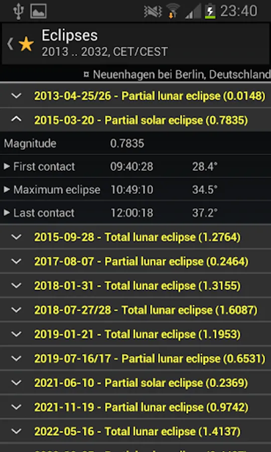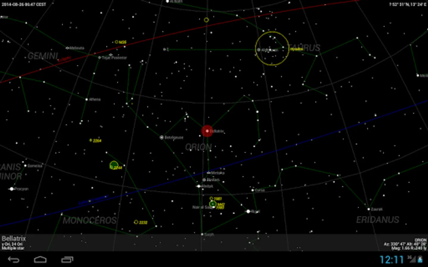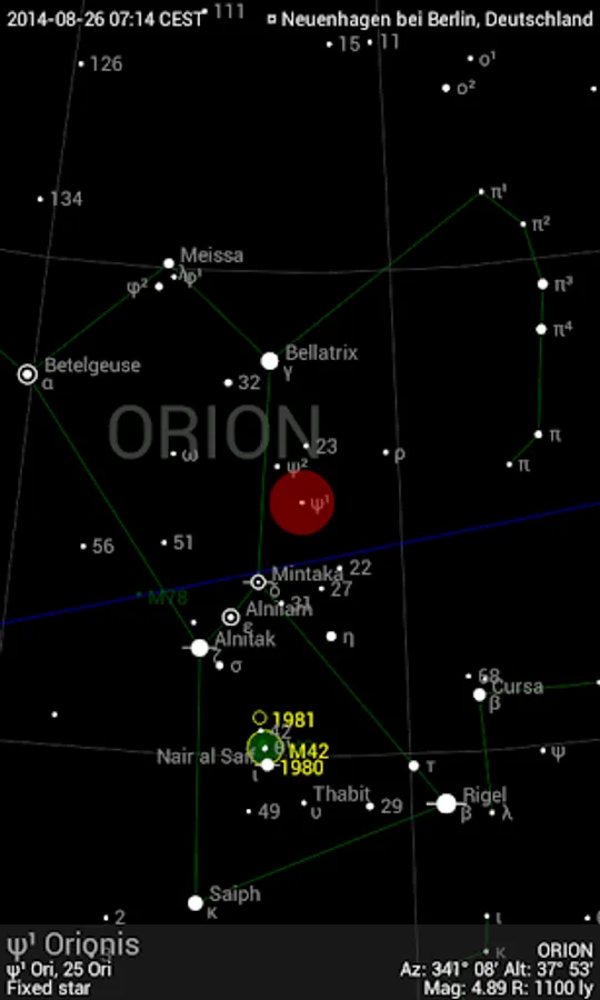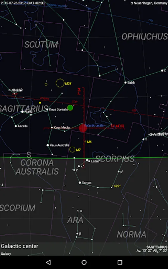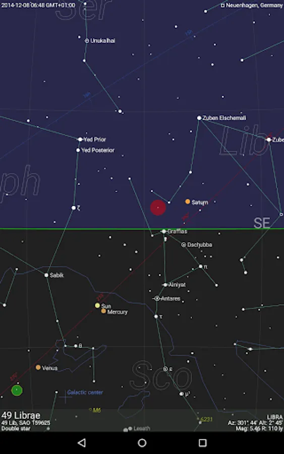 The basic app function displays a detailed and scalable celestial map with constellations and celestial objects (limit magnitude up to 6.3) that are visible with the naked eye or smaller telescopes. The place and time of observation as well as the direction of view can be manually configured by the user or automatically with the so-called “Live mode” (i.e. GPS, real-time and compass-guided).