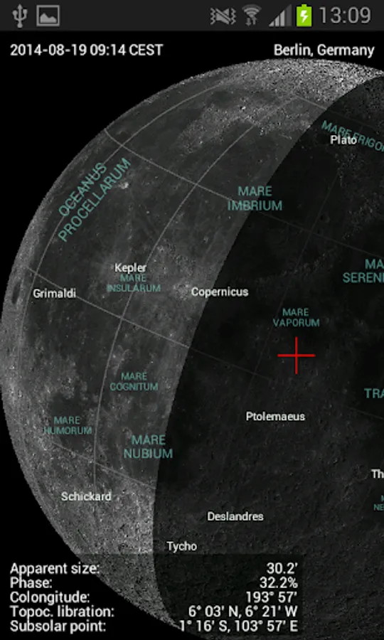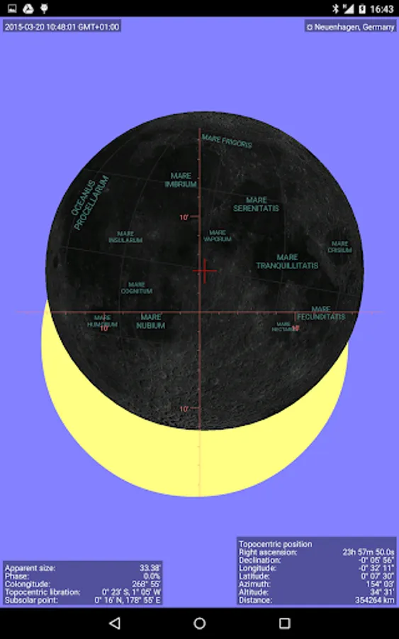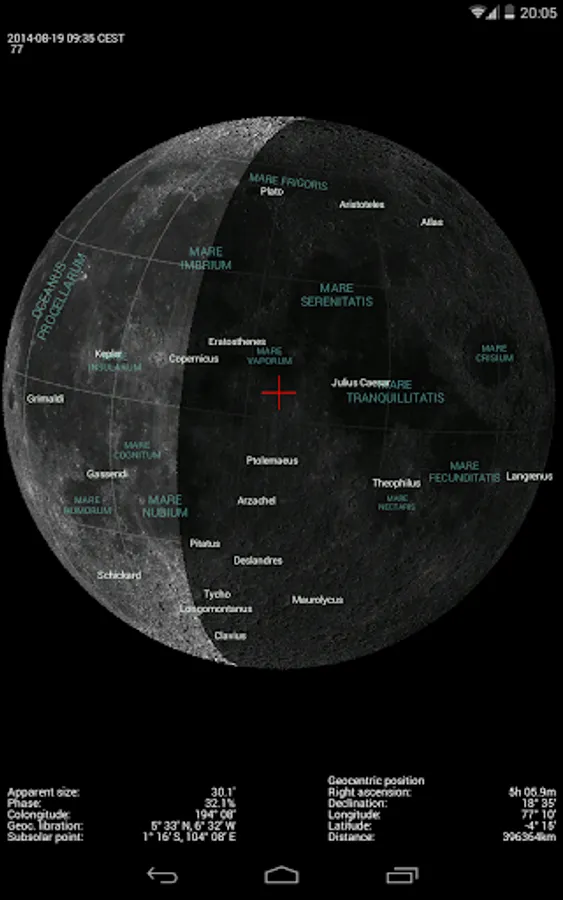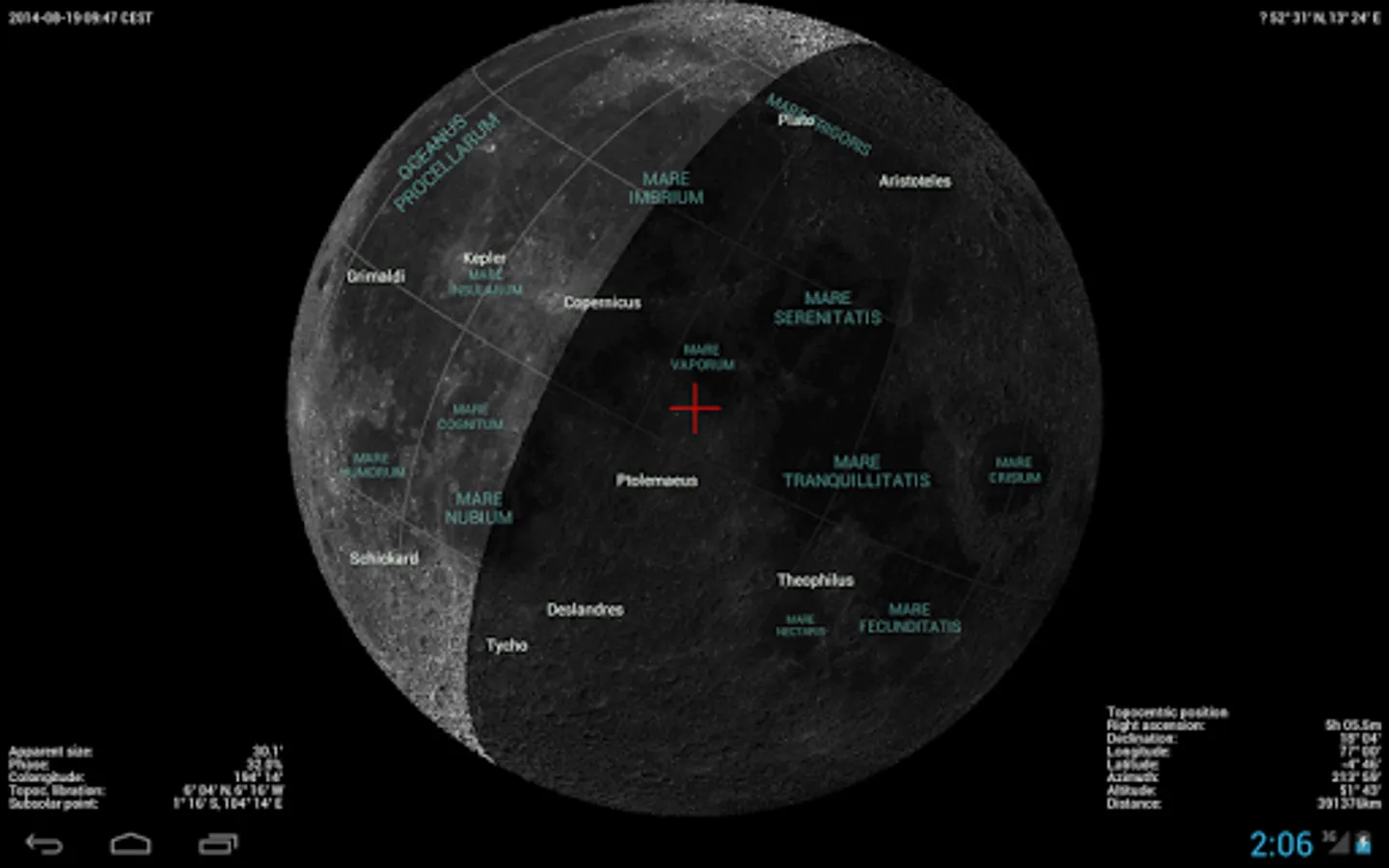 • Optional labeling of the major lunar features (maria, craters, mountains, lacus, sinus, paludes)