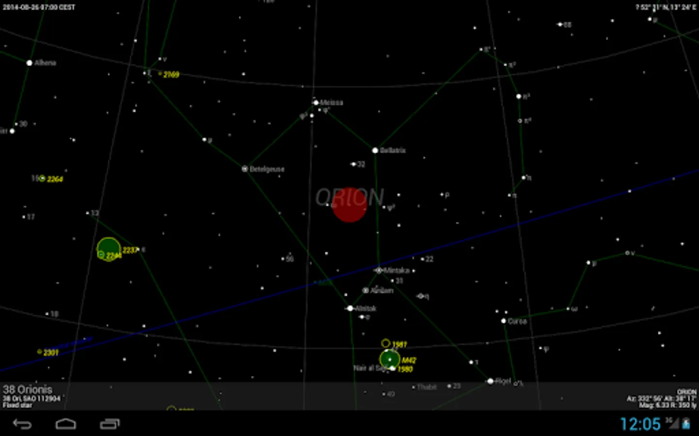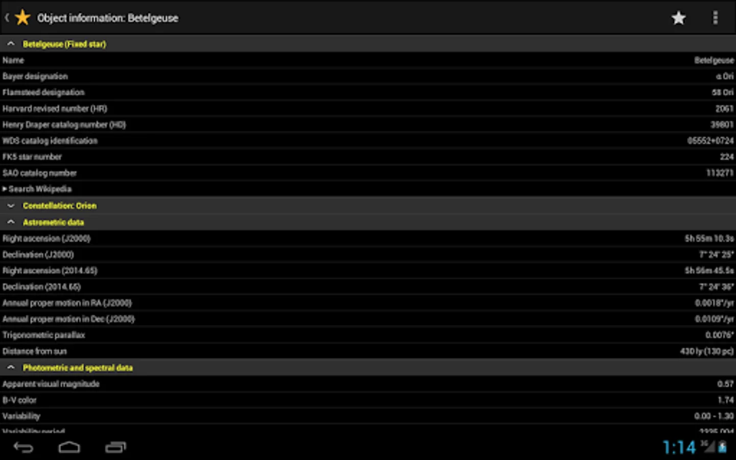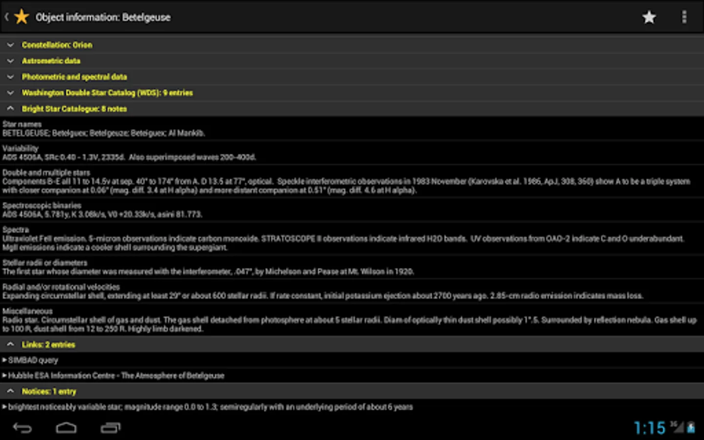 Detailed additional information is available for every celestial object (fixed star, deep sky object, planet, moon, sun, meteorite shower). The information of the Bright Star Catalog and the Washington Double Star Catalog is made available for fixed stars. Additionally, users can add notes and links for every object.