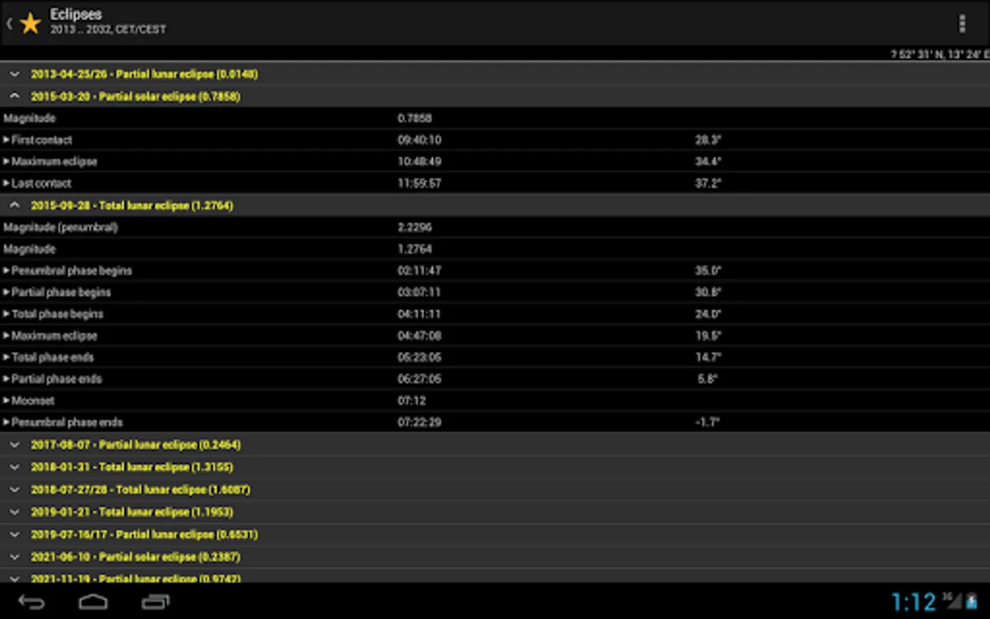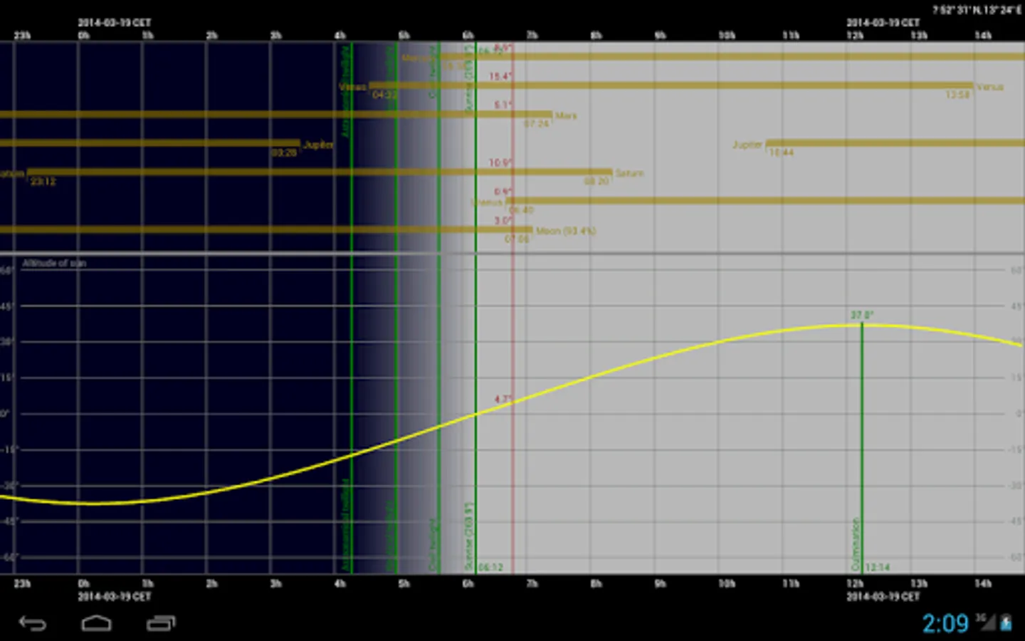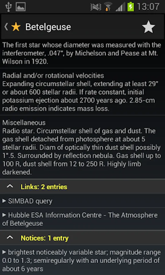 Detailed additional information is available for every celestial object (fixed star, deep sky object, planet, moon, sun, meteorite shower). The information of the Bright Star Catalog and the Washington Double Star Catalog is made available for fixed stars. Additionally, users can add notes and links for every object.