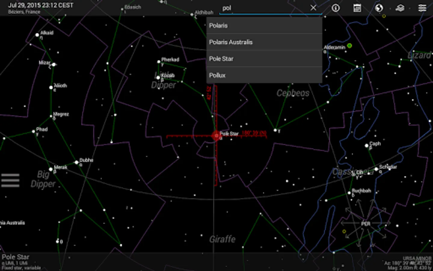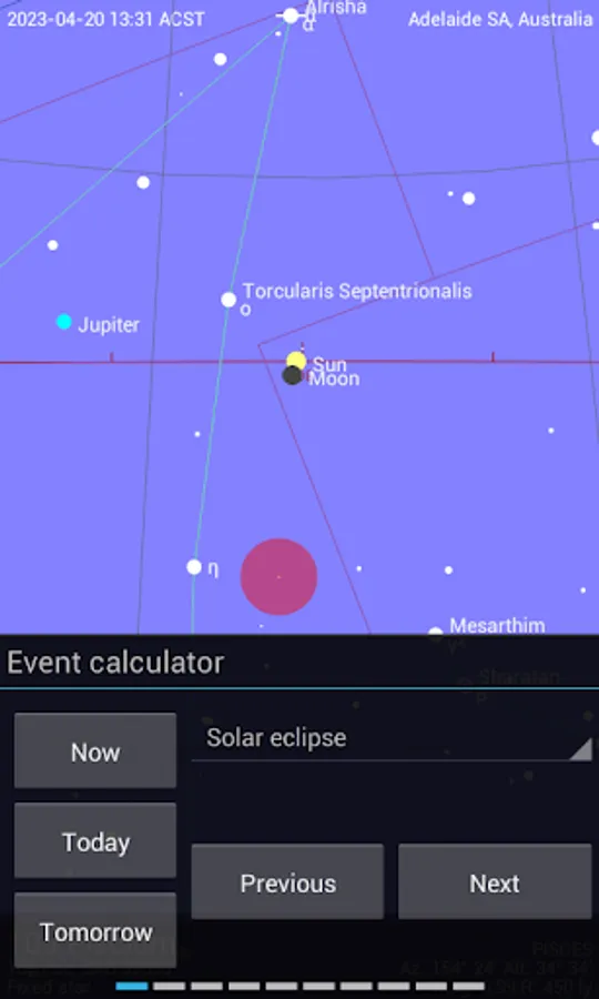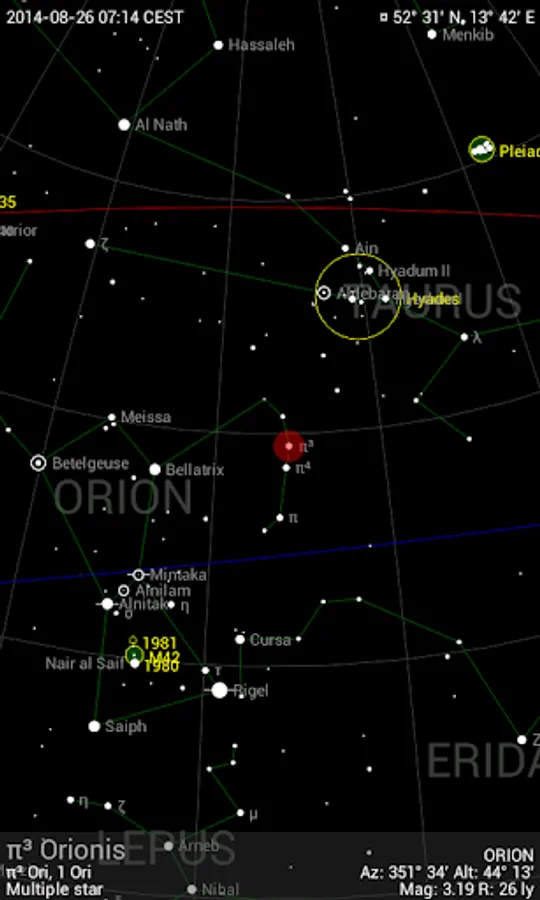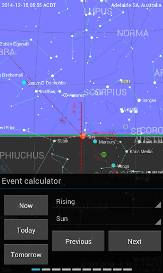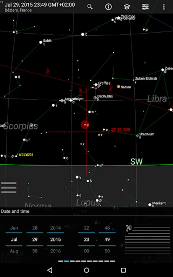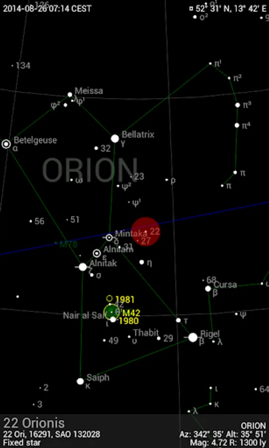 Detailed additional information is available for every celestial object (fixed star, deep sky object, planet, moon, sun, meteorite shower). The information of the Bright Star Catalog and the Washington Double Star Catalog is made available for fixed stars. Additionally, users can add notes and links for every object.