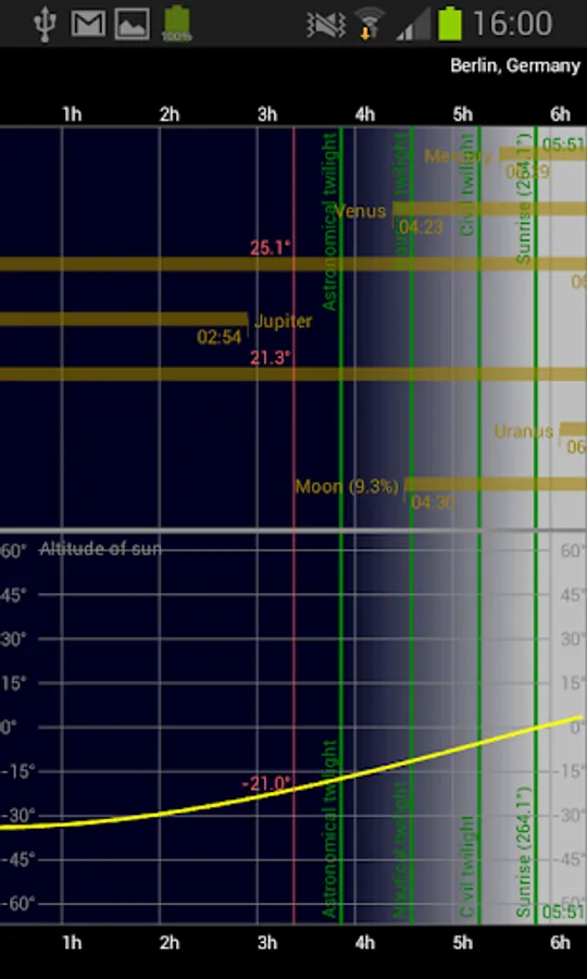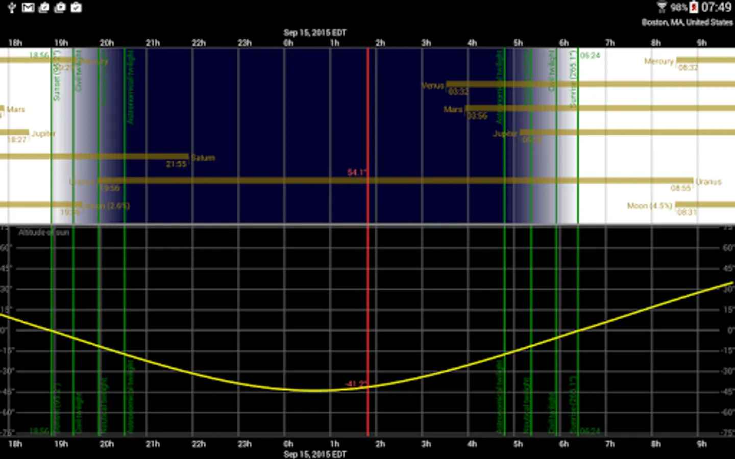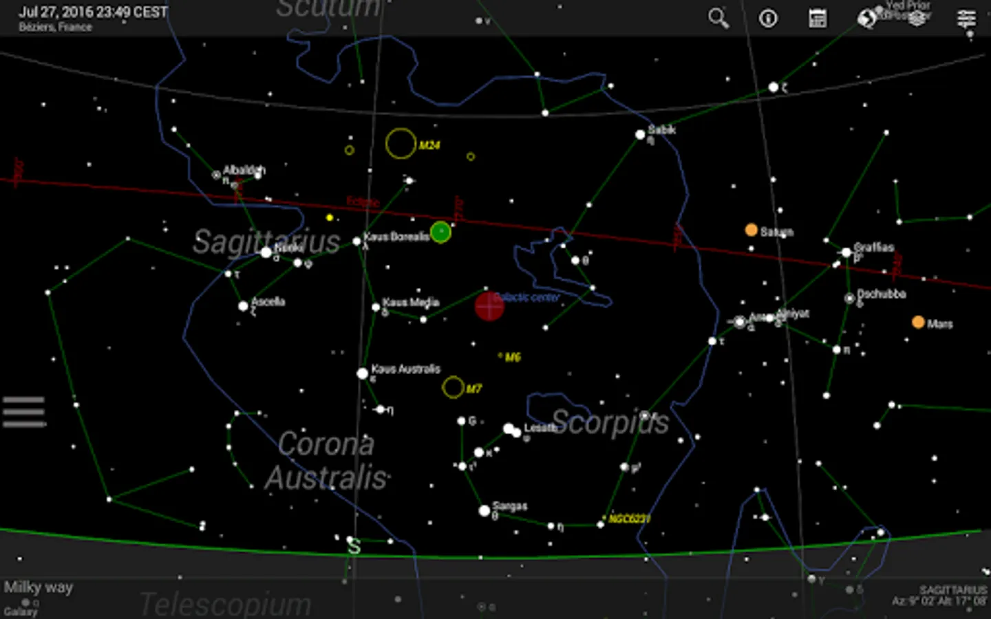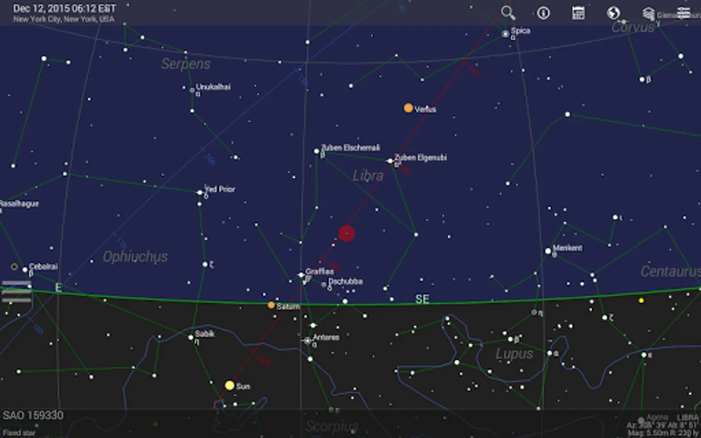 Detailed additional information is available for every celestial object (fixed star, deep sky object, planet, moon, sun, meteorite shower). The information of the Bright Star Catalog and the Washington Double Star Catalog is made available for fixed stars. Additionally, users can add notes and links for every object.