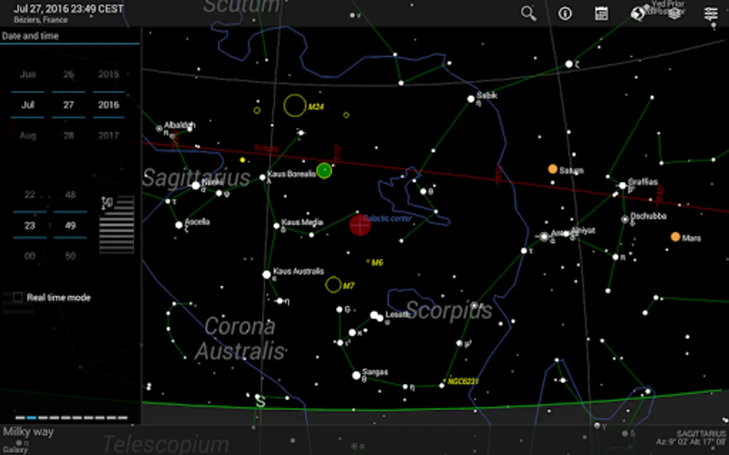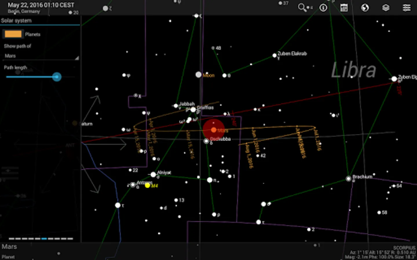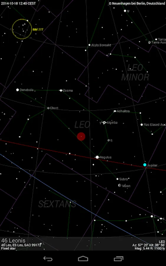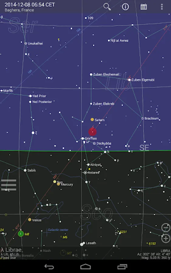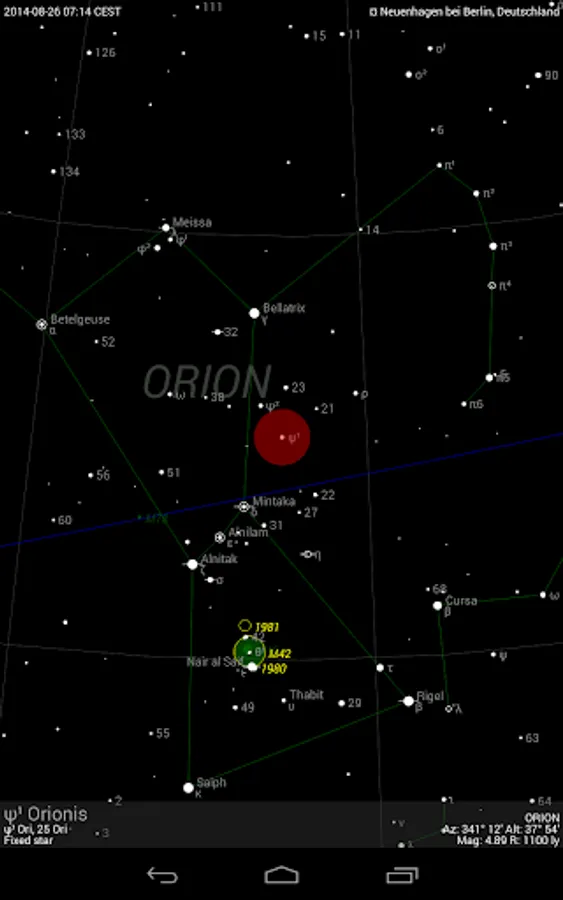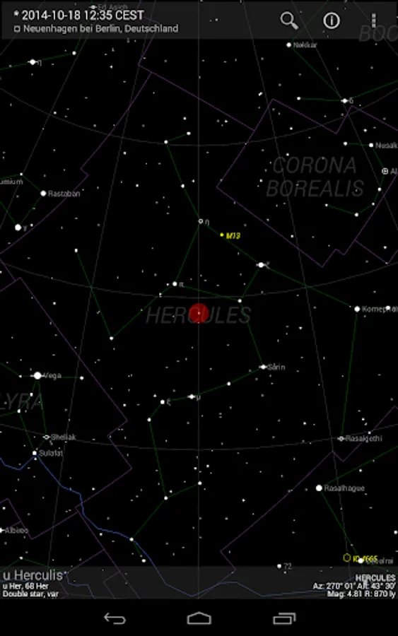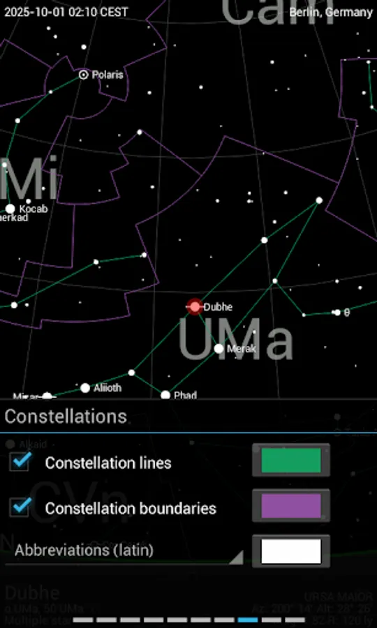 The basic app function displays a detailed, scalable and fully user-configurable celestial map with constellations and celestial objects (limit magnitude up to 6.3) that are visible with the naked eye or smaller telescopes. The place and time of observation as well as the direction of view can be manually configured by the user or automatically with the so-called “Live mode” (i.e. GPS, real-time and compass-guided).