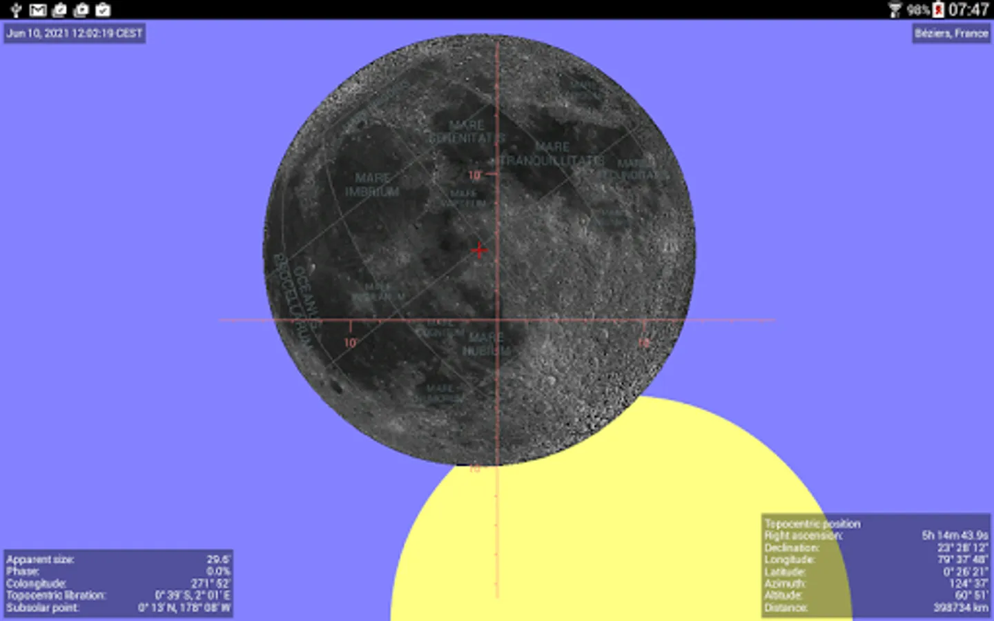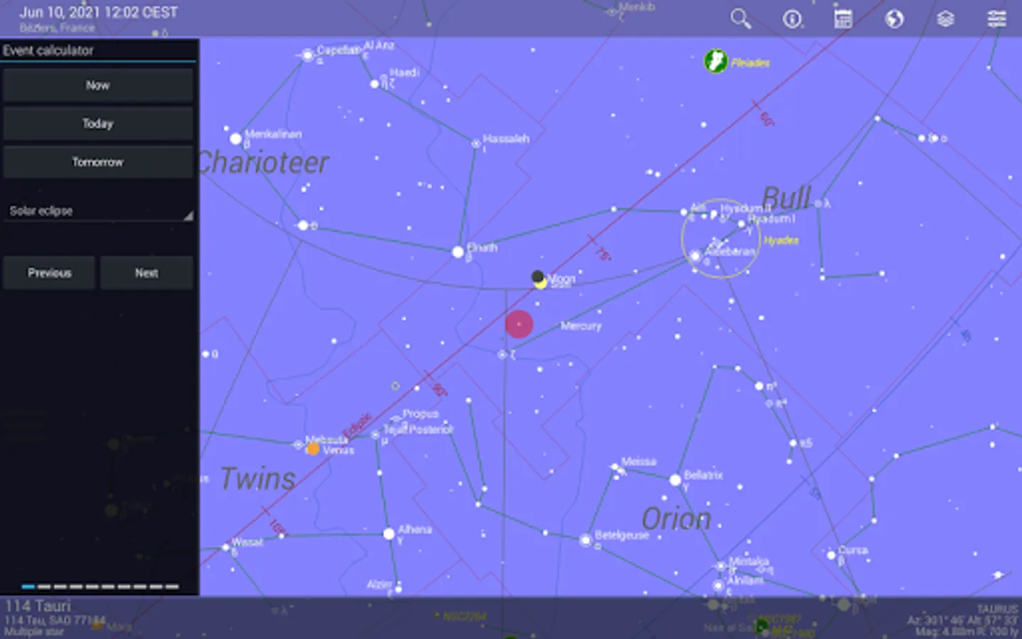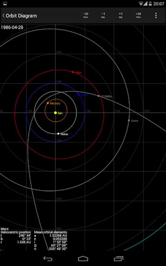 The functionality of the app is complemented by a number of astronomical tools and data, e.g. an astronomical event calculator, an orbit diagram (orrery), a moon viewer (a scalable, orthogonal, geocentric or topocentric moon projection while properly taking the libration, moon phase, position angle and parallactic angle into account) and an ephemerides generator.