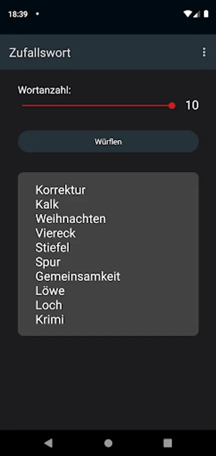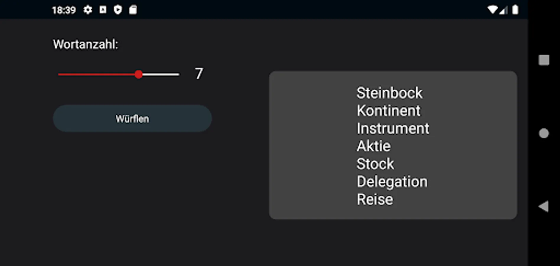 The app displays up to ten at random terms. These are suitable for games, such as pantomime, Pictionary or Hangman.