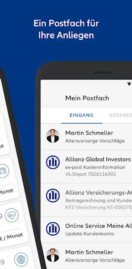 The security of your data is important to us. You can exchange messages securely and encrypted with your Allianz contact person via the mailbox. In addition, you can secure the app once with a code via SMS.