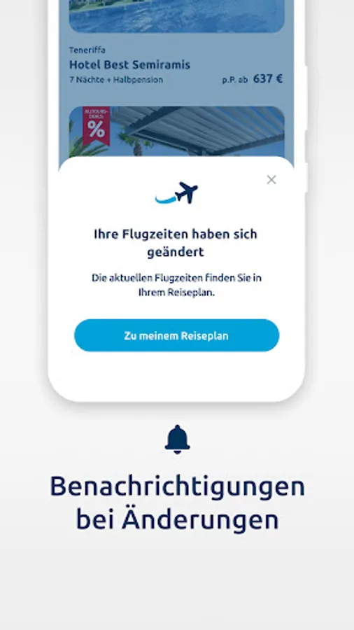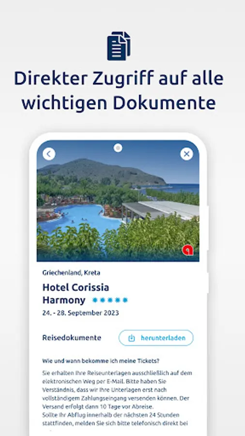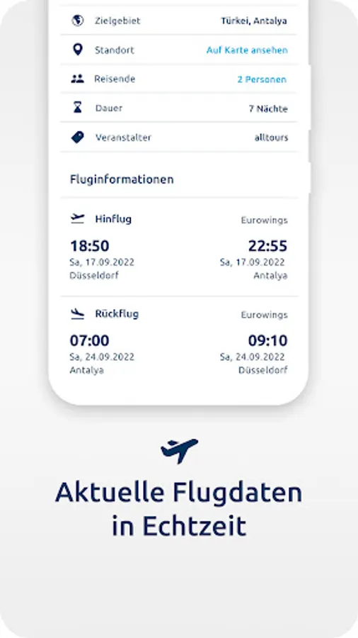 Everything at a glance: You will find all the important information about your holiday in your travel app. Travel dates, flight details and updates on your flights, accommodation and transfer times. Your app puts flight changes and other important travel information at your fingertips. It doesn't matter whether it's photos of the hotel or sights in the area: Get that holiday feeling at home and click straight to the holiday destination.