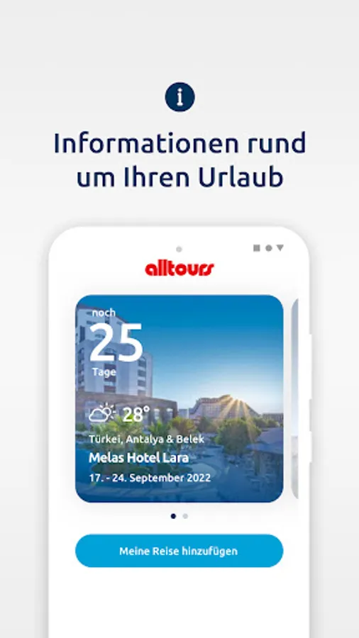 Flight times, hotel information, information on how to get there, excursion tips, weather forecast and now also transfer times: You will find all information about your upcoming holiday in your alltours travel planner. Check your travel dates in the app and find out more about your accommodation at your leisure. The alltours app is a practical companion for your upcoming trip.