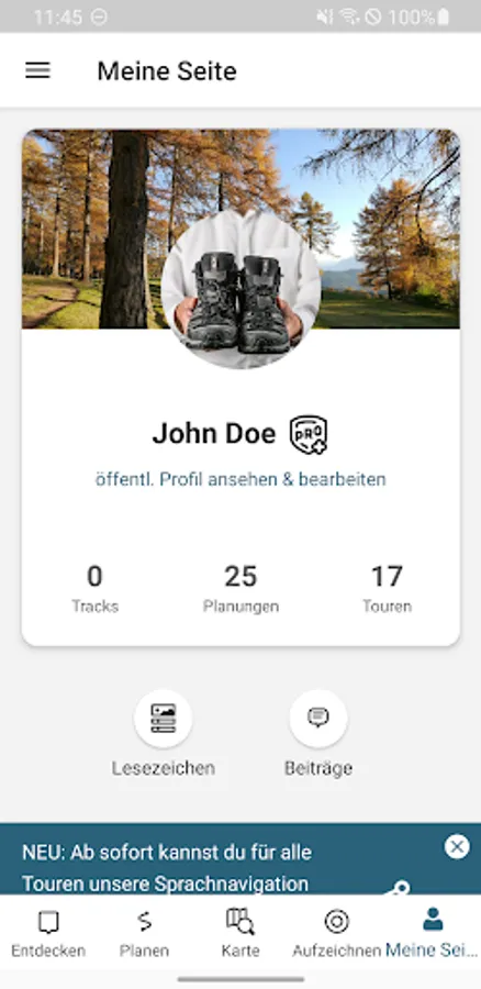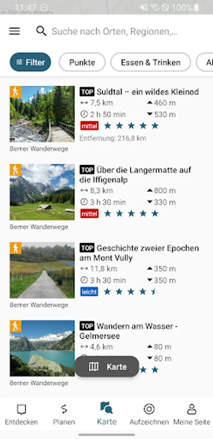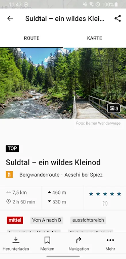 Or choose a suitable tour from over 500 hiking suggestions. In addition to the map display and the detailed route description, the suggestions also contain an altitude profile, technical information on the hiking time, route length and altitude difference as well as recommendations for attractions and sights along the way.