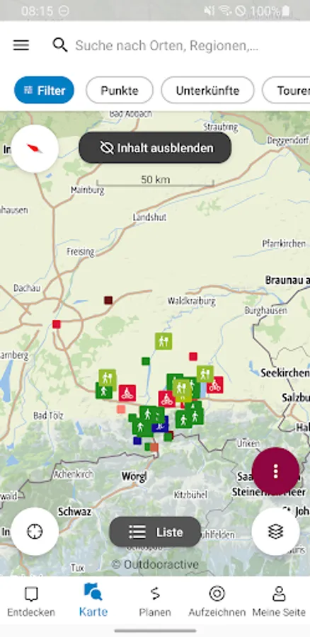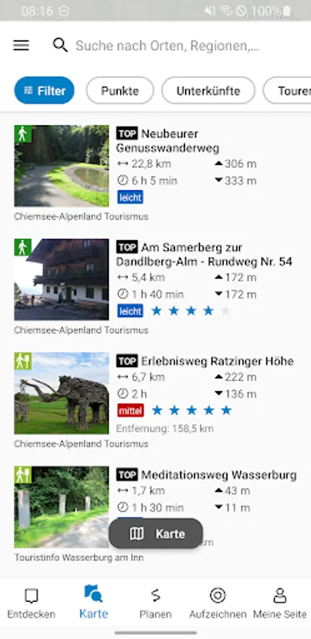 - Filtering by sport/difficulty/distance/altitude/duration or by map view. Can be narrowed down according to characteristics such as "family-friendly", "round tour" or "refreshment stop" etc.