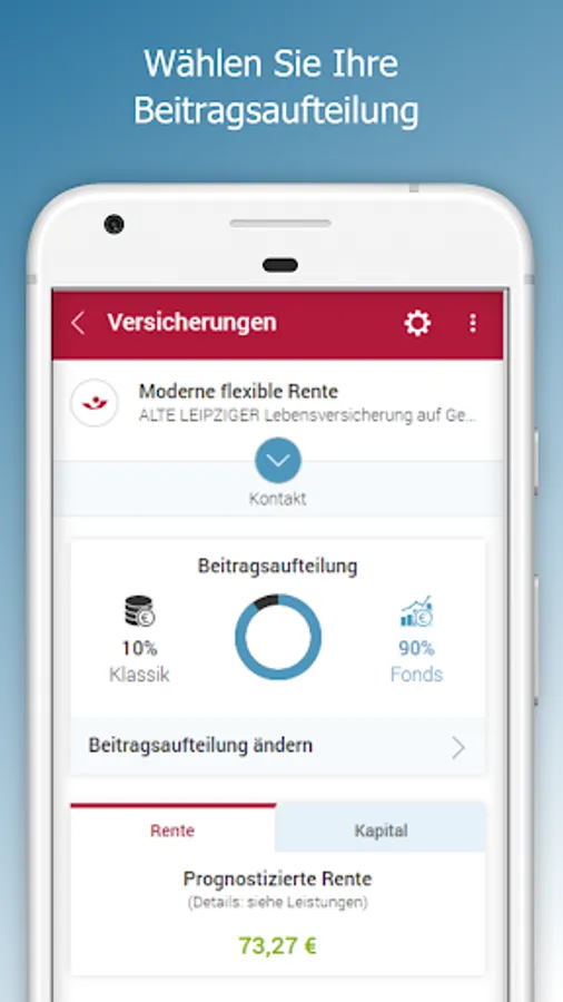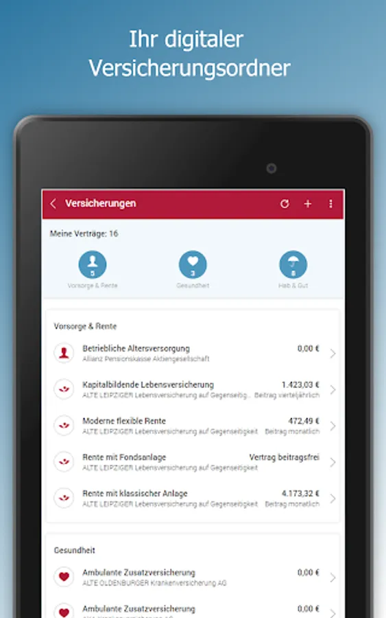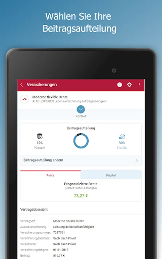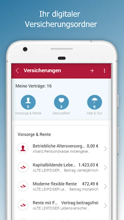 • OLD LEIPZIGER - HALLESCHE contracts are automatically displayed with current data, documents and corresponding interactions (e.g. change of funds, change of contribution allocation, reallocation / securing of fund balances, change of subscription rights, deferral, notification of damage and change of address ... )