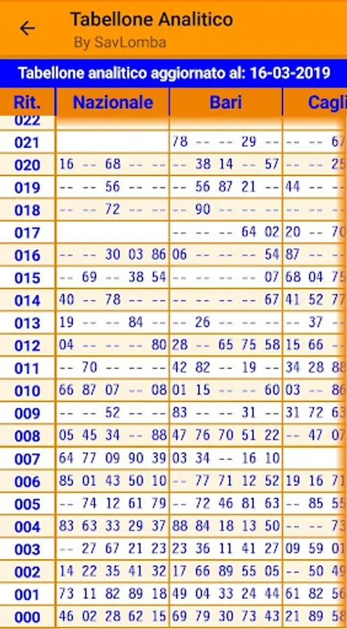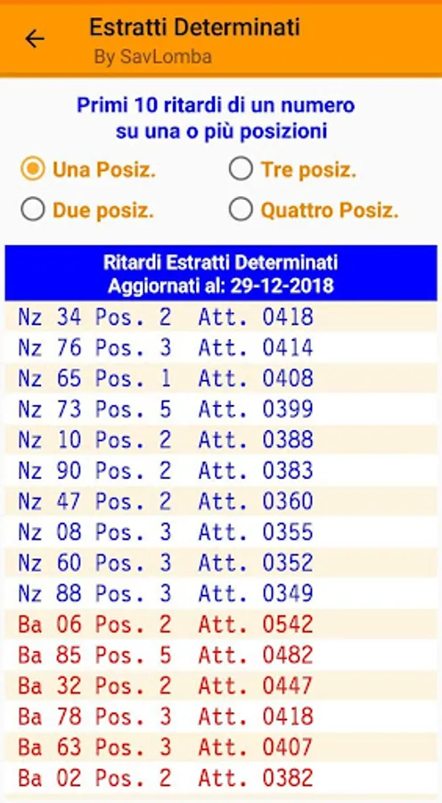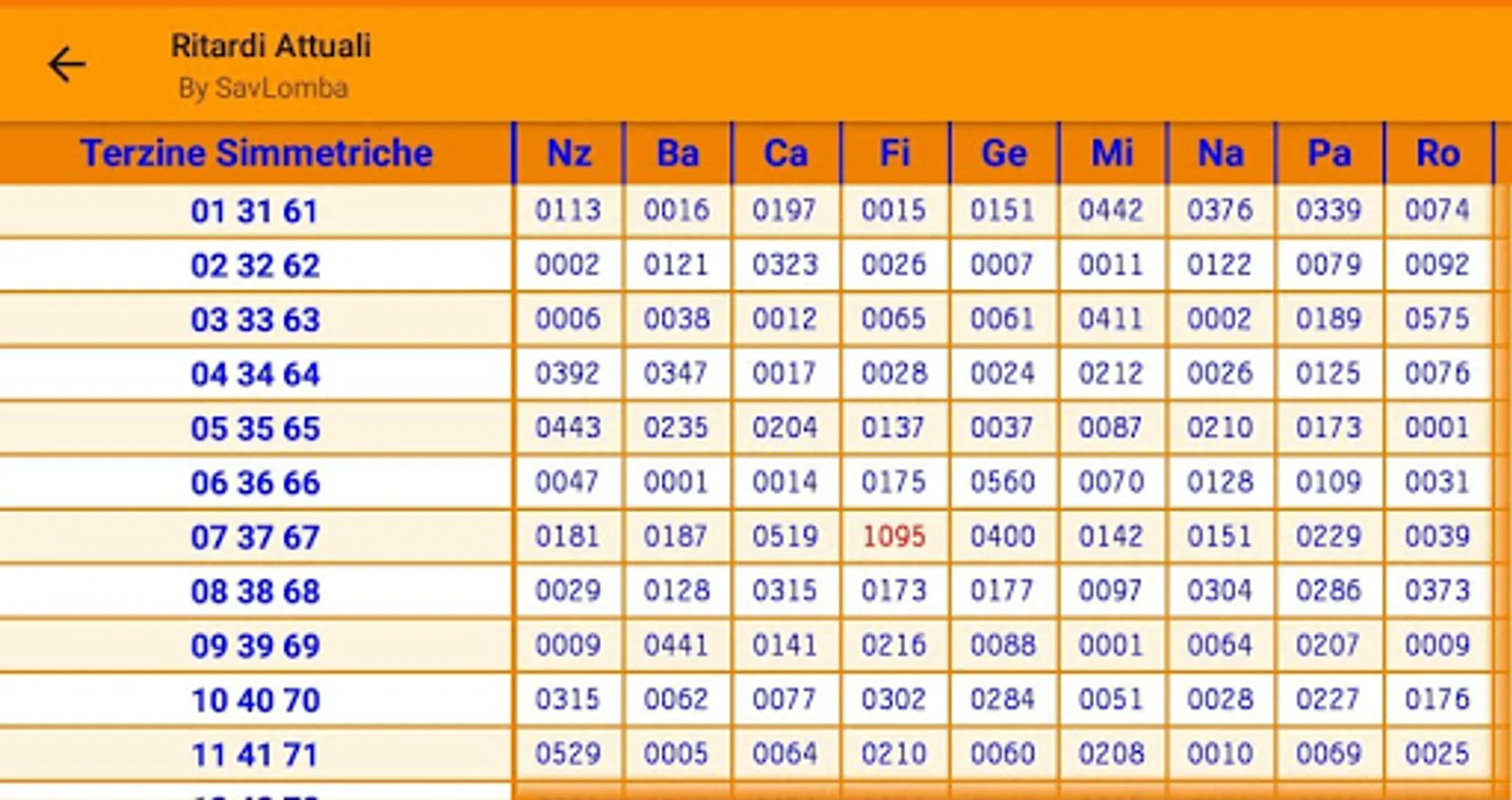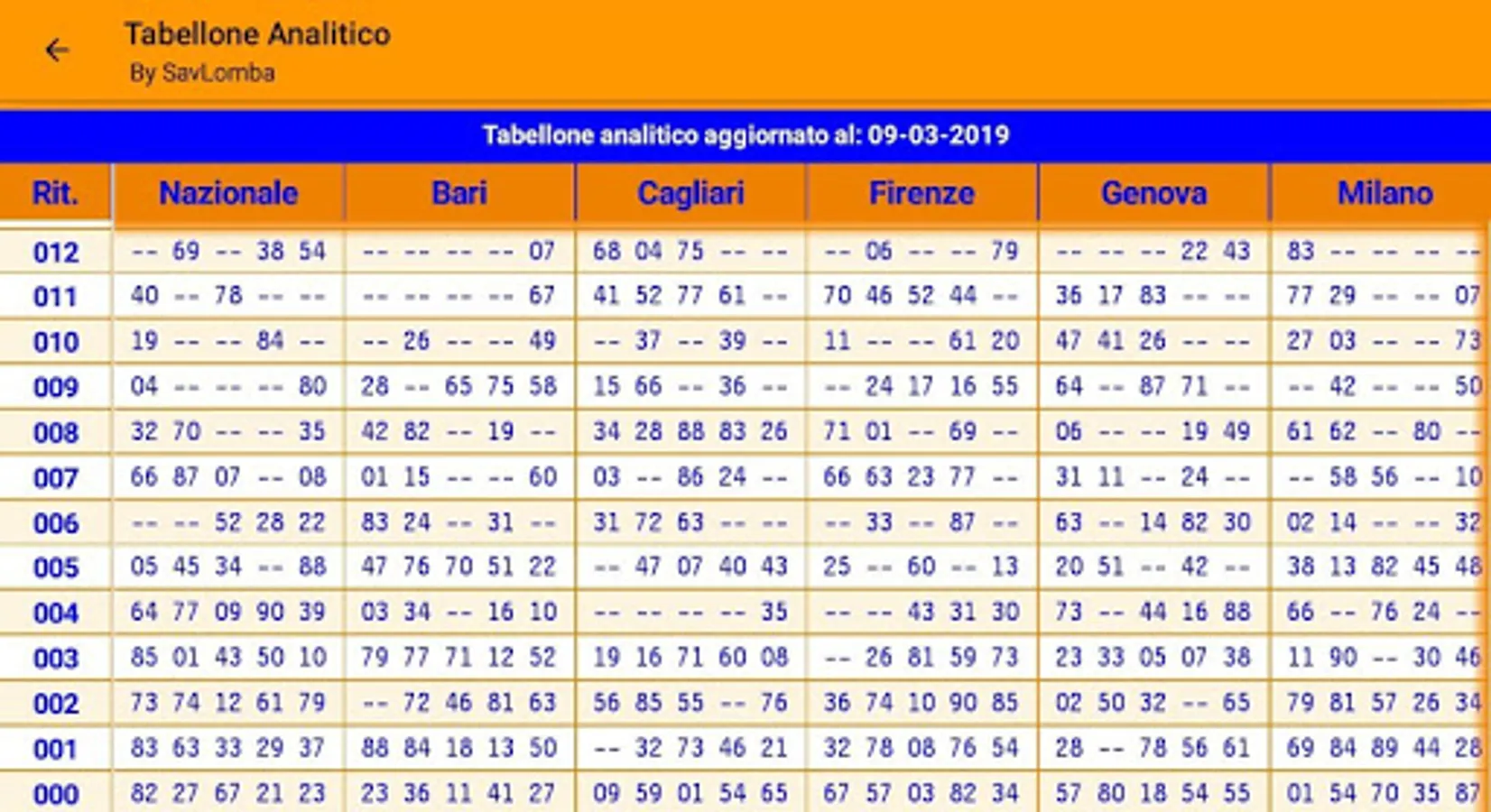 "Band Rit. 01-18 "," Band Rit. 19-36 "," Band Rit. 37-54 "and so on up to" Fascia Rit. > 90 "show the numbers of the chosen draw that had a delay before the sortie, included in the range of the selected delay band.