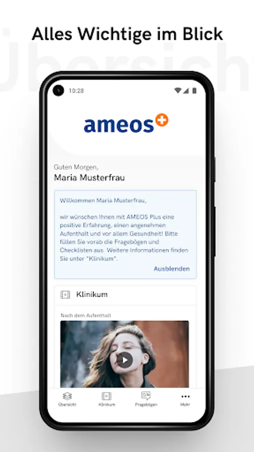 AMEOS Plus accompanies you as a patient in our clinic right from the start: As an intuitive application, you receive helpful information, checklists and reminders before, during and after your stay. So you always have the perfect overview and are not left alone with us.