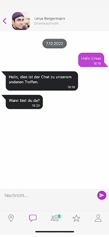 After an accepted meeting, whether you accept a request or another person accepts a request from you, you can immediately write to each other via a chat function in the app. So you don't have to exchange numbers or anything else.