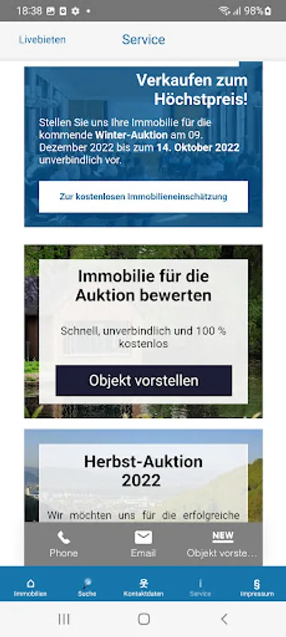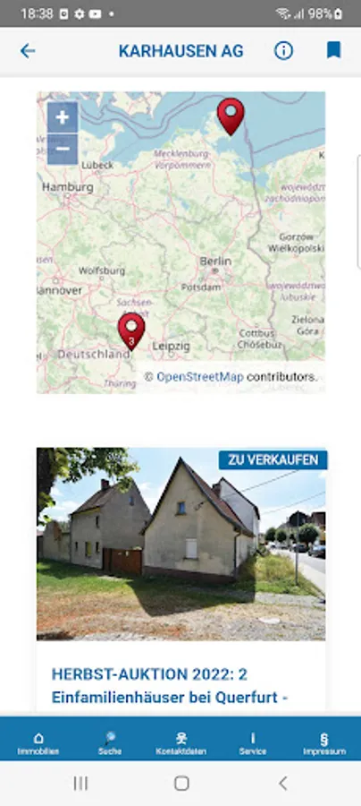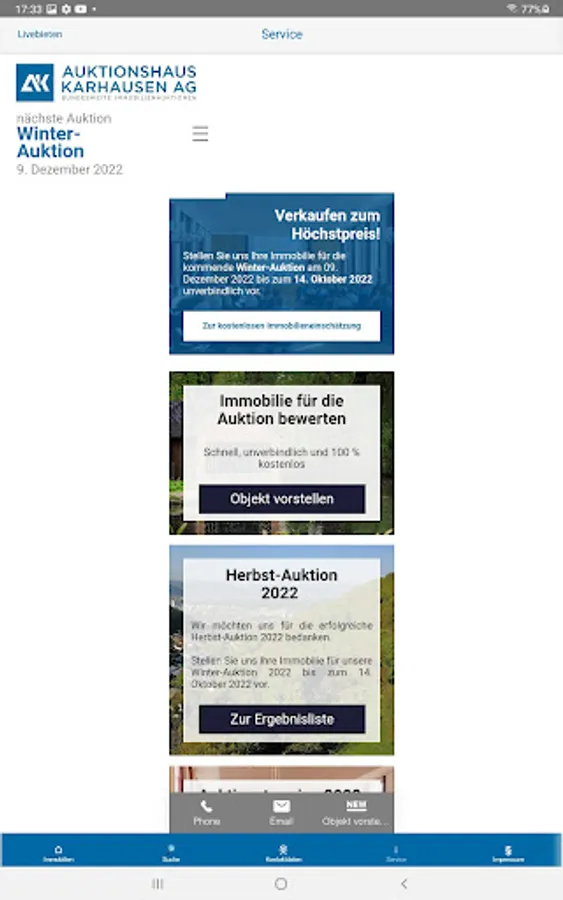With the free AUKTIONSHAUS KARHAUSEN AG app you have access to object offers from our current auctions. You will also automatically and exclusively receive news about new admissions.