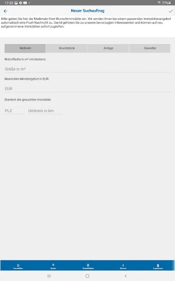 - Receive push notifications as soon as a suitable property has been added