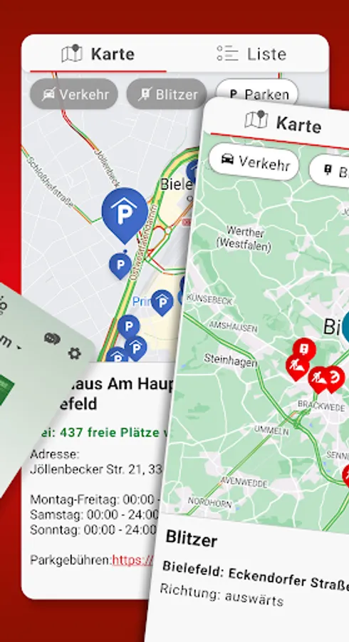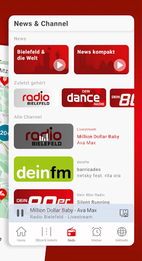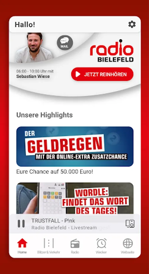 The Radio Bielefeld app is now even more informative and faster. You can use the contact button to send us text or voice messages, pictures and videos directly to the studio. We have now clearly summarized the traffic jams, speed cameras, multi-storey car parks and spaces on a map. In order to see them, please make sure to give the necessary permissions during installation - also for our push function, with which you can open our local breaking news directly as a message.